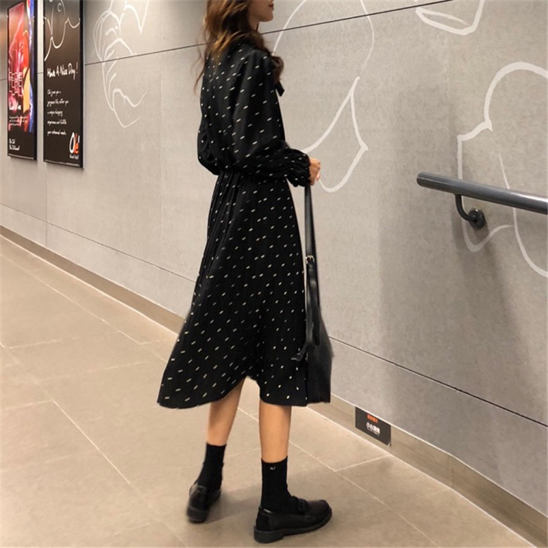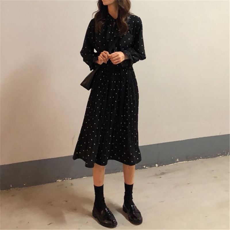/ 秋季女裝韓版氣質中長款波點壓褶長袖連衣裙chic復古港味學生裙子