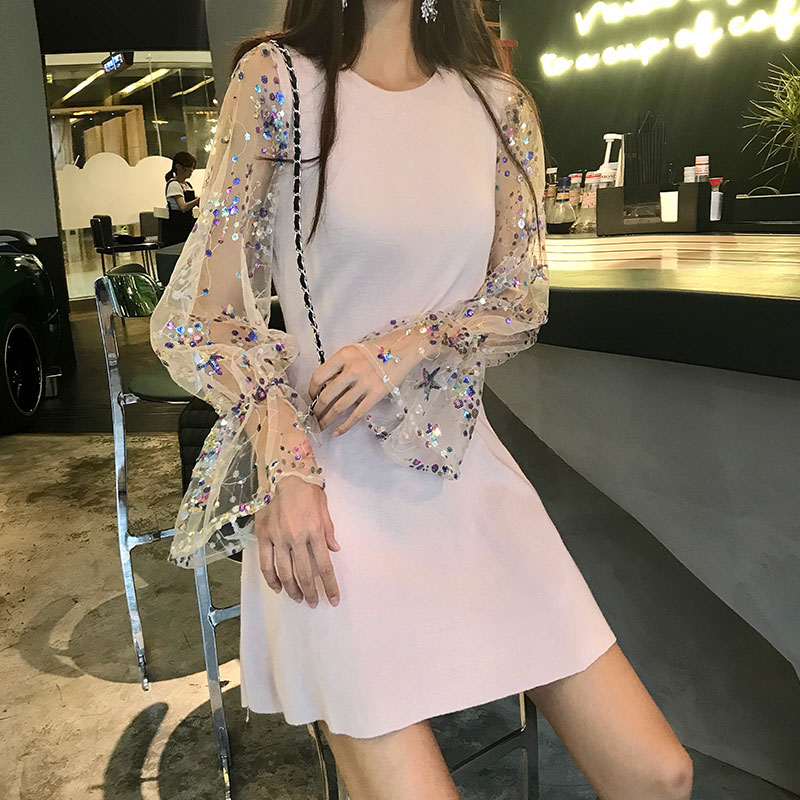 2018網紅針織亮片網紗拼接連衣裙女長袖早秋新款A字打底裙中長款