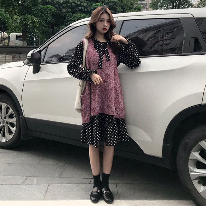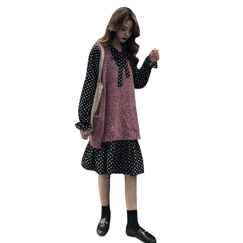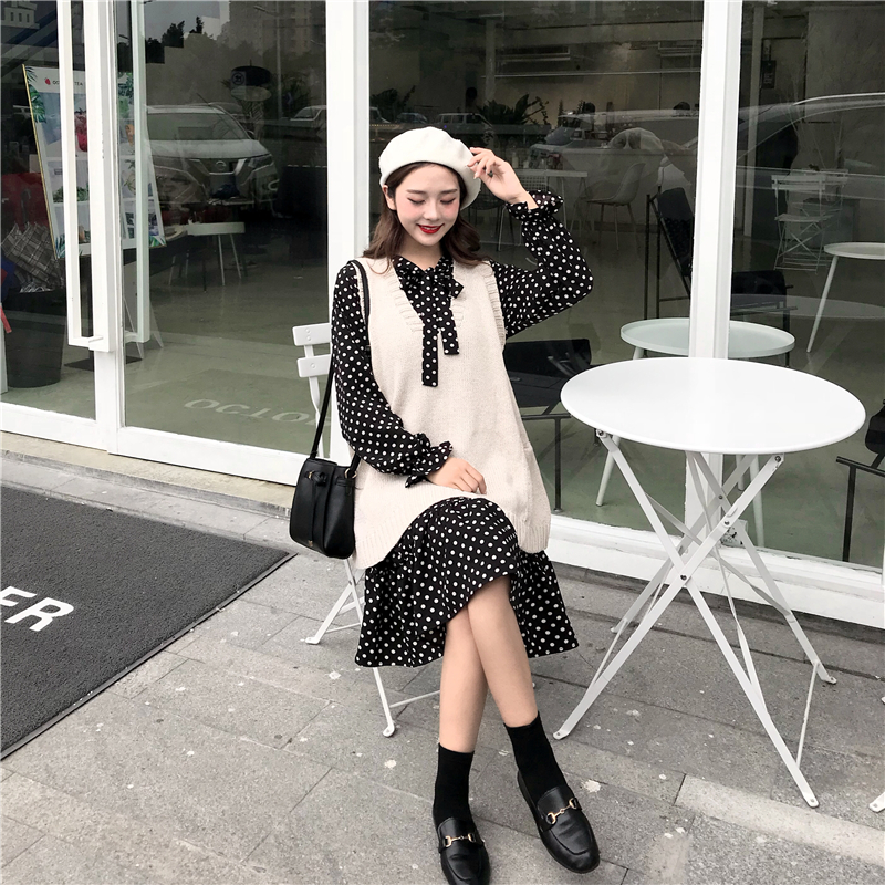 / 韓版時尚休閑套裝秋季女裝中長款波點連衣裙+針織毛衣背心兩件套