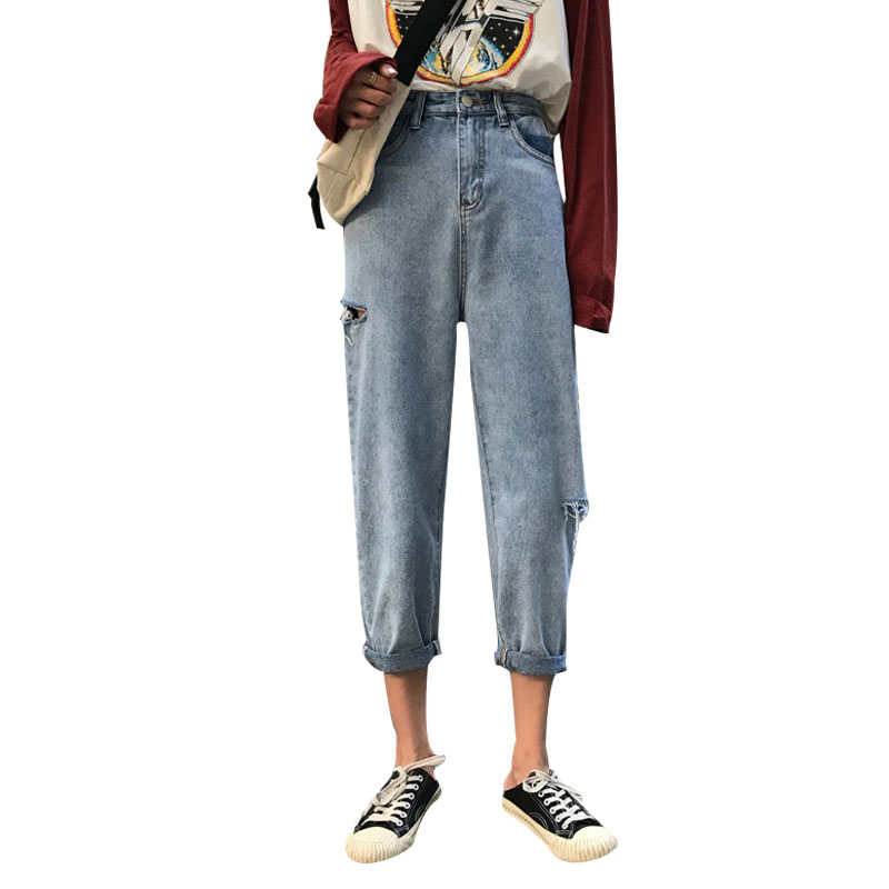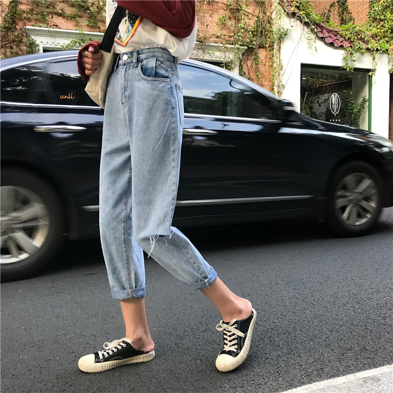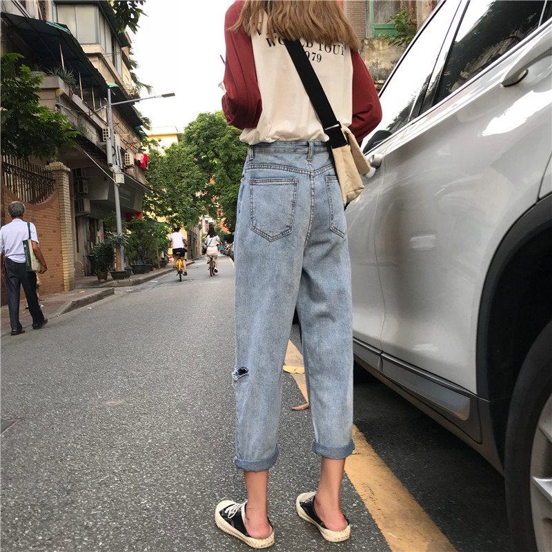 / 秋裝女裝韓版寬松百搭水洗哈倫褲牛仔褲高腰顯瘦破洞直筒褲九分褲