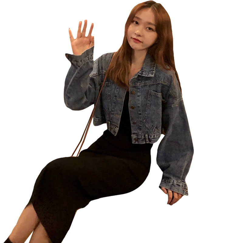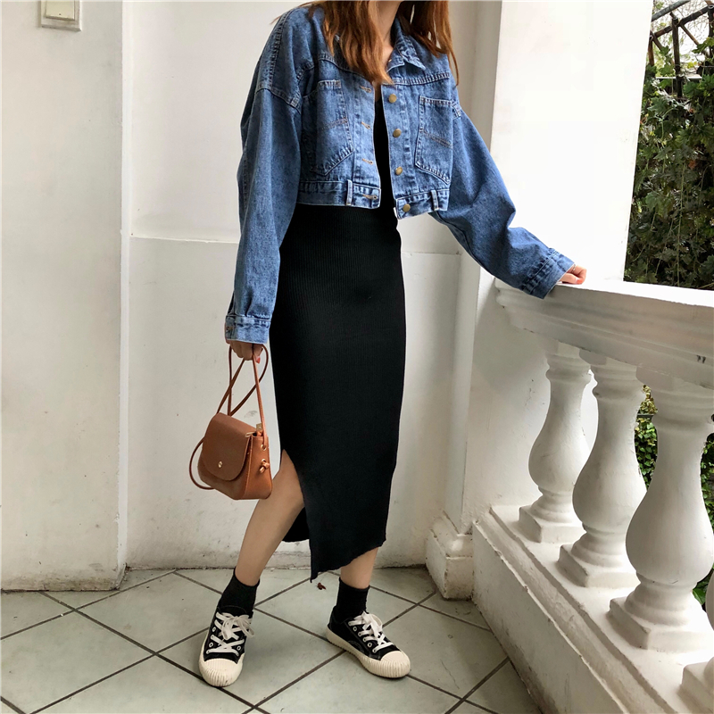 / 韓版時尚休閑套裝秋季女裝針織衫吊帶連衣裙+短款牛仔外套兩件套