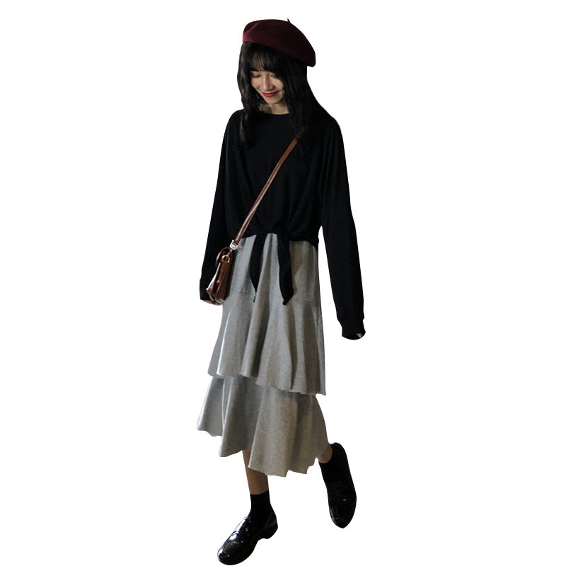 / 韓版時尚休閑套裝秋季寬松長袖系帶t恤+高腰蛋糕裙半身裙兩件套女
