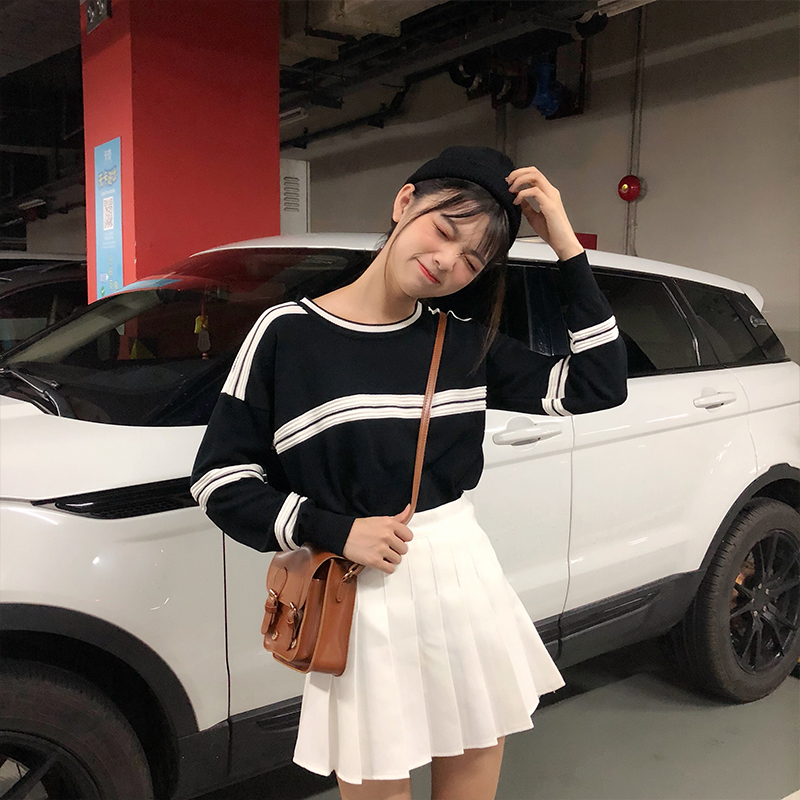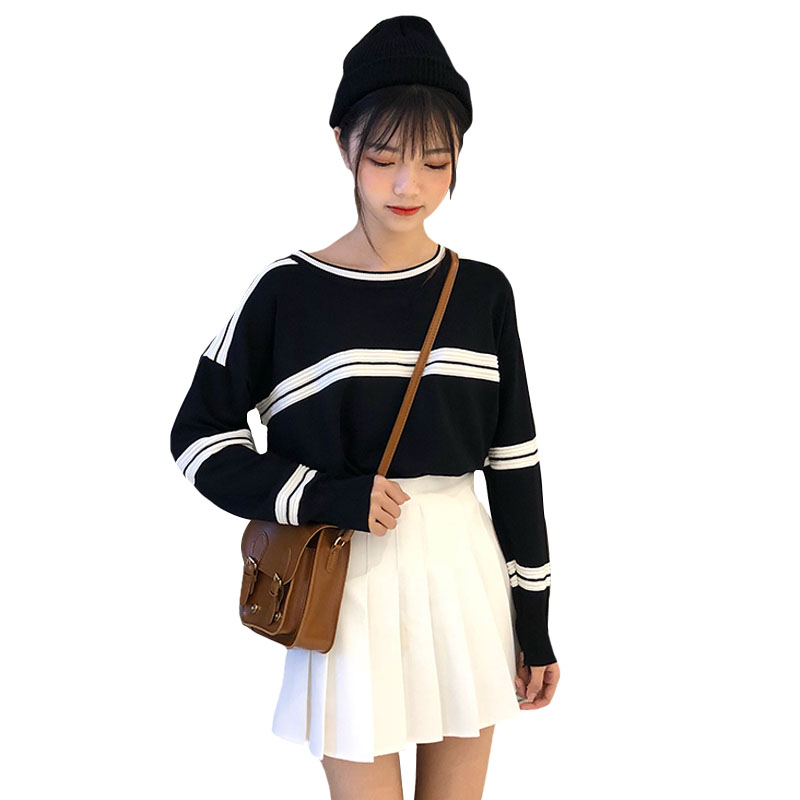 / 秋季女裝韓版學院風長袖套頭針織衫學生寬松百搭條紋顯瘦毛衣上衣