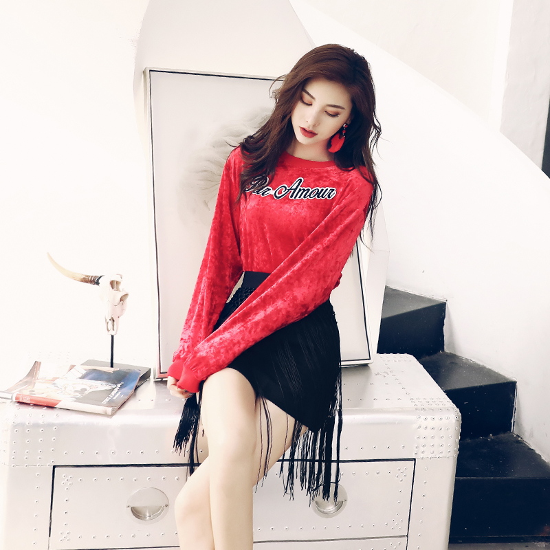 / 紅色超火衛衣女套裝裙2018新款秋季長袖上衣流蘇半身短裙兩件套潮