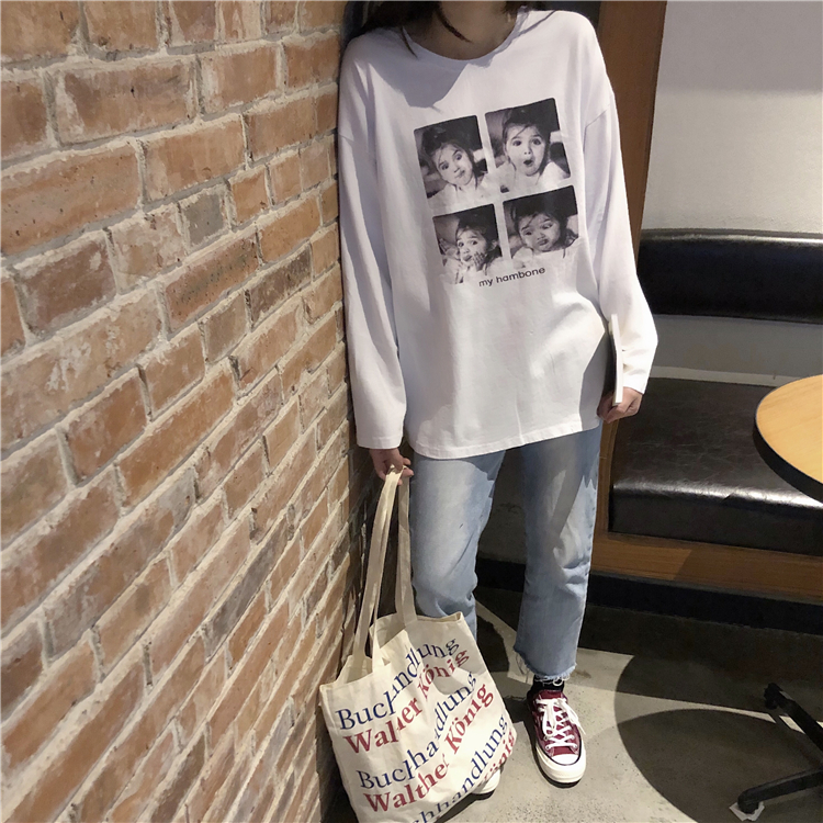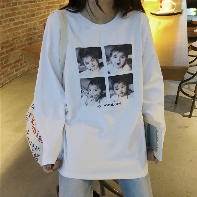 / 秋季女裝韓版中長款原宿風卡通字母寬松百搭長袖休閑顯瘦T恤上衣