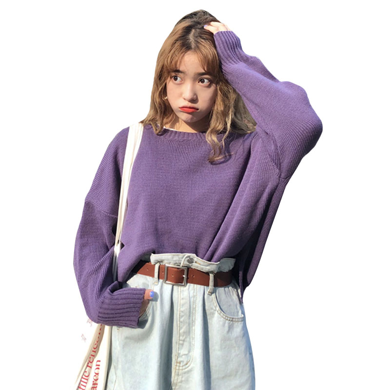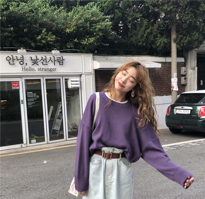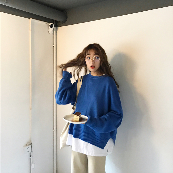/ 秋冬女裝韓版基礎款純色寬松針織衫上衣側邊開叉長袖套頭毛衣外套