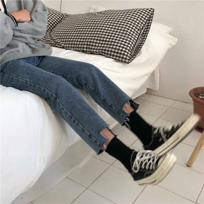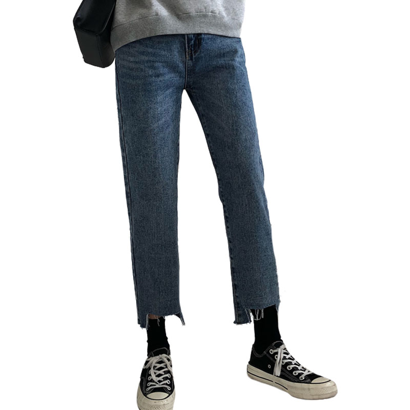 / 秋裝女裝韓版寬松水洗高腰百搭褲腳缺口九分褲牛仔褲直筒褲長褲潮