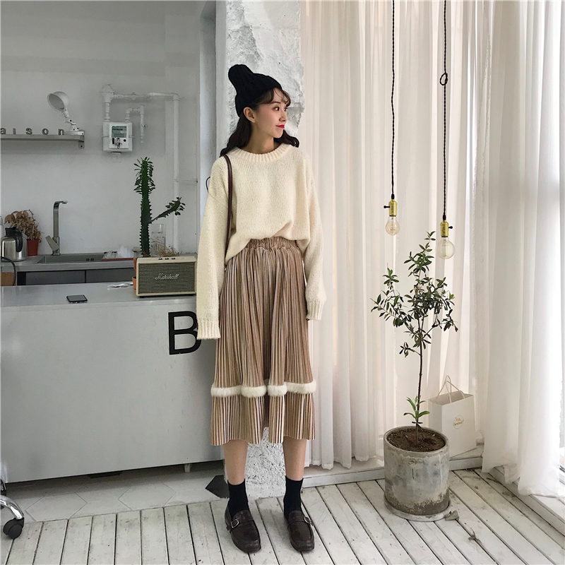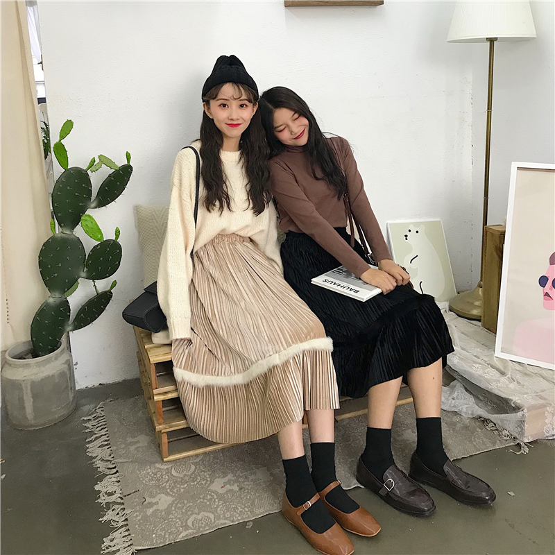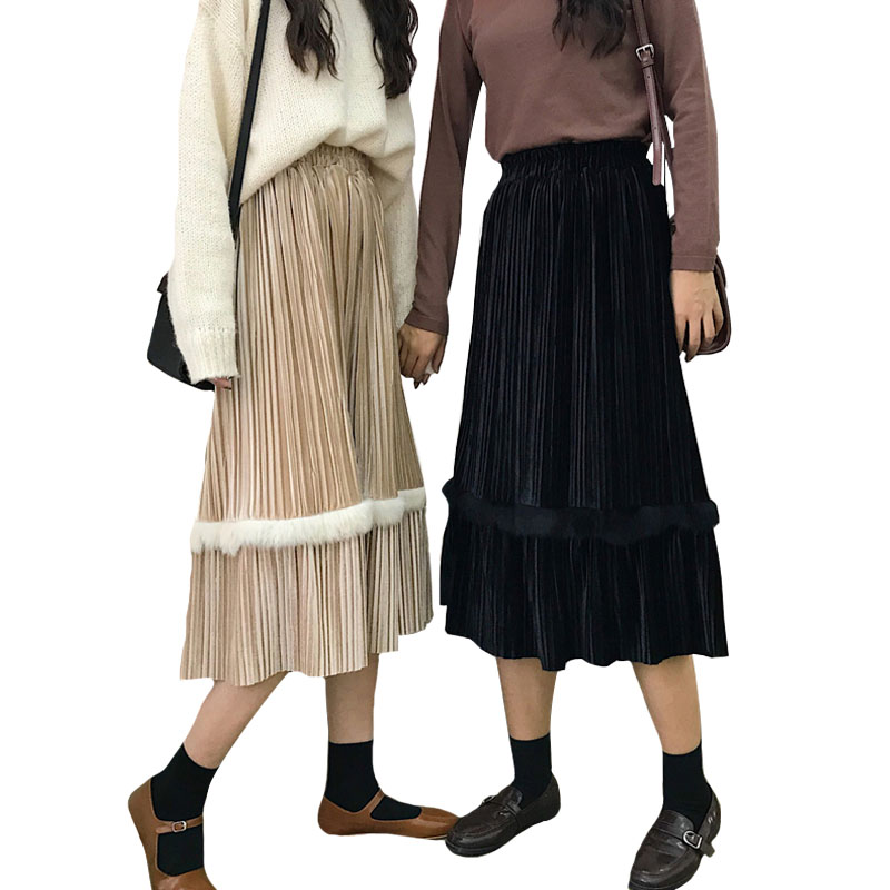 可可里小姐~2018秋冬新款絲絨百褶中長款半身裙