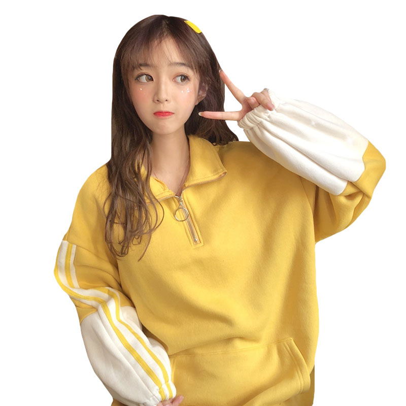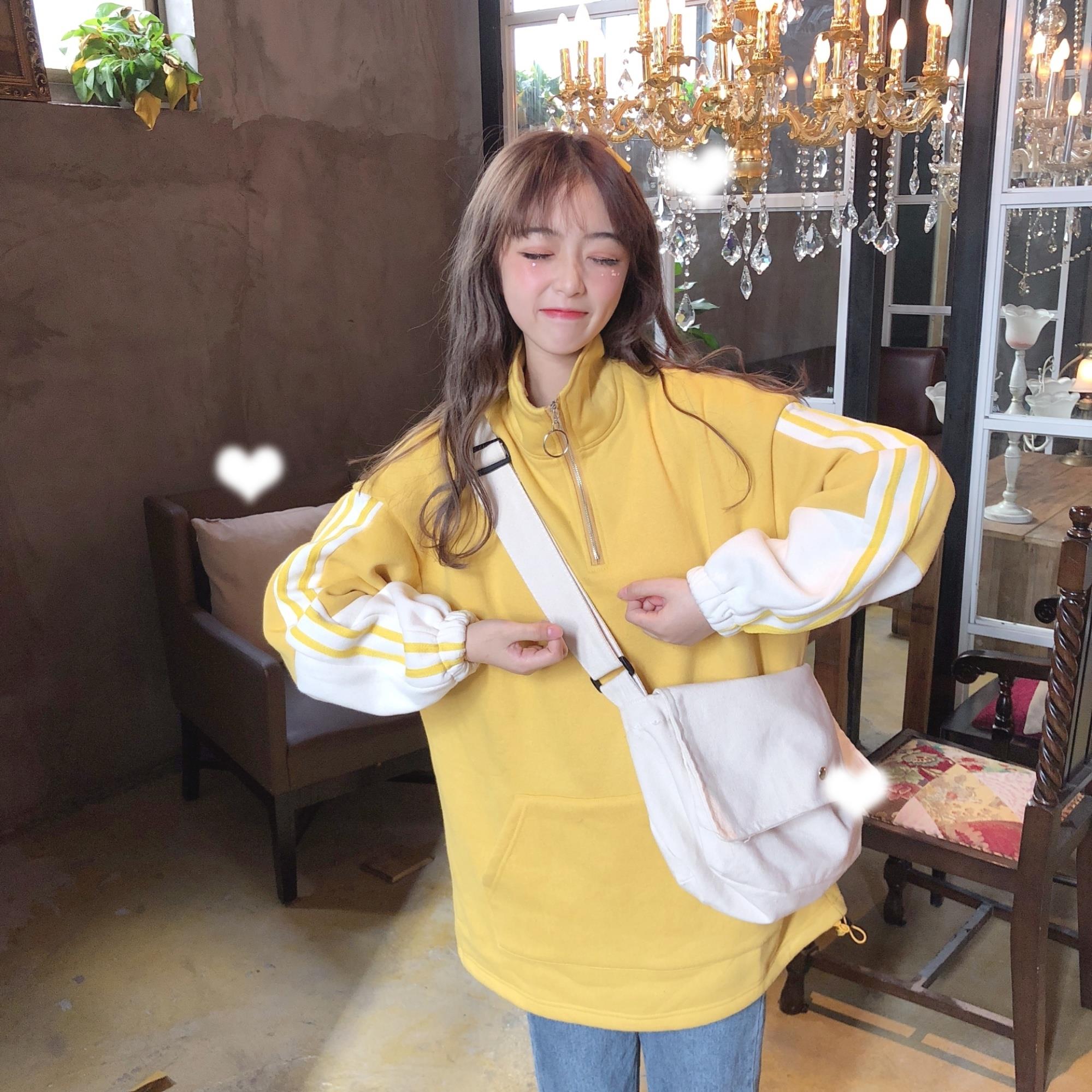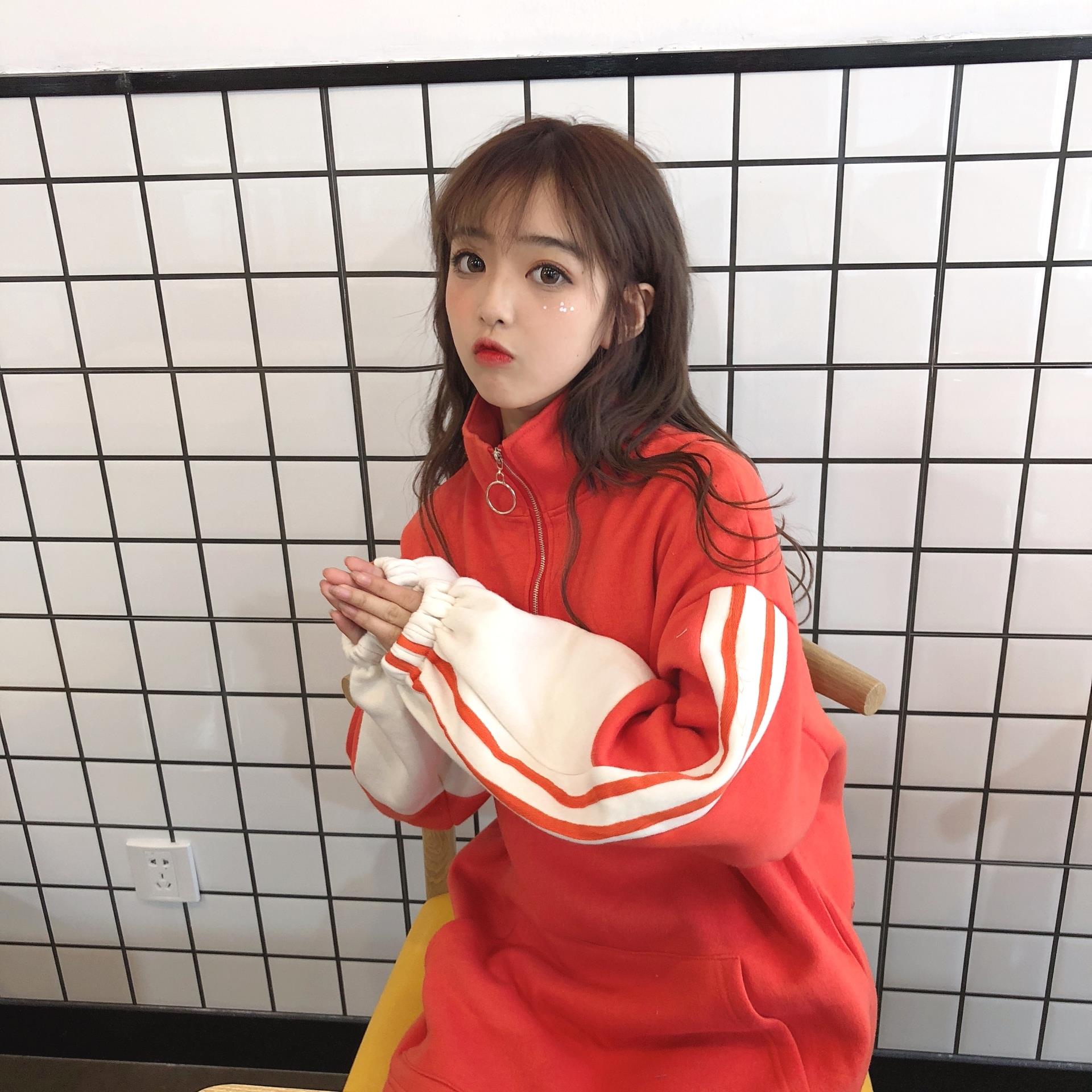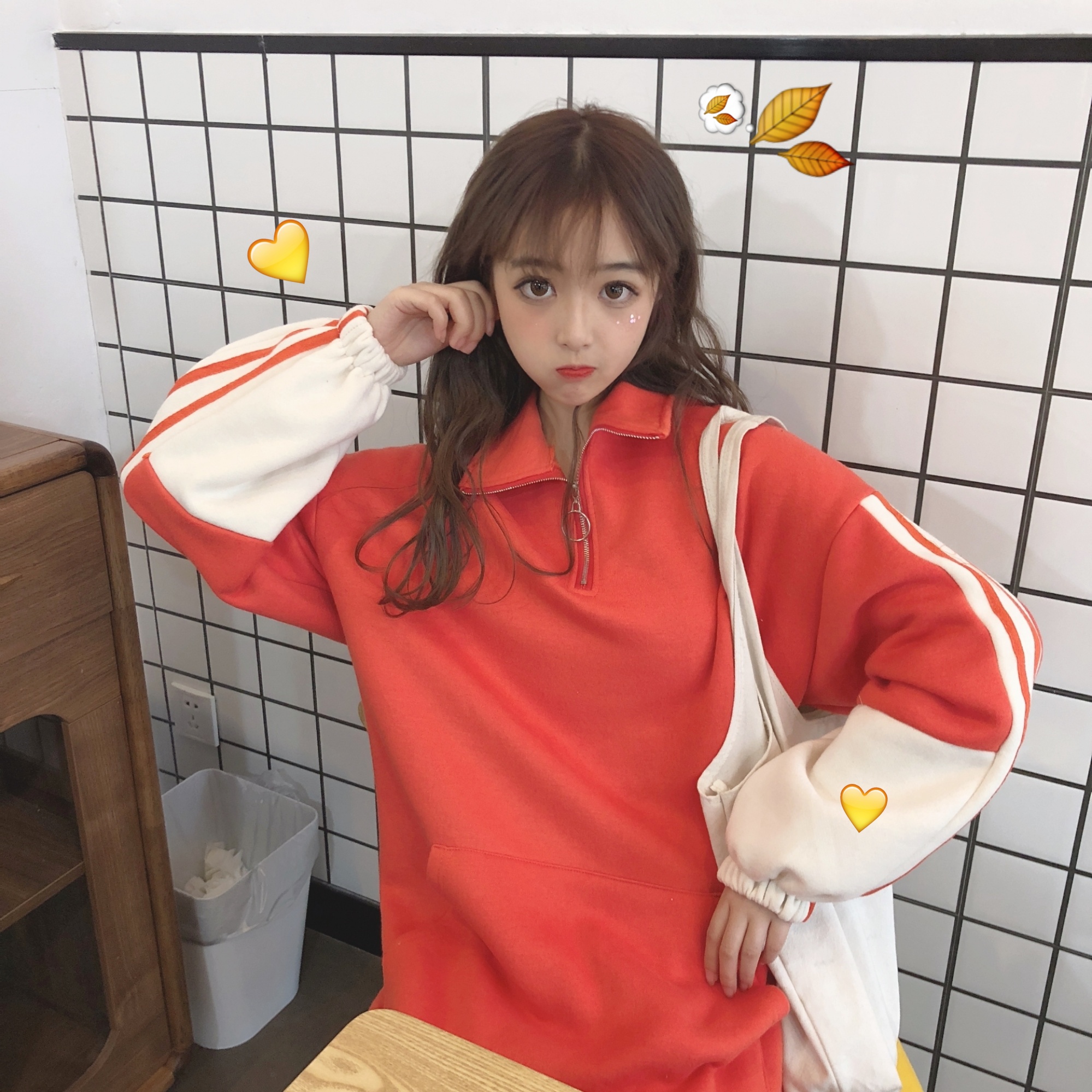 秋冬韓版中長款寬松立領加絨加厚拼色高領套頭超火衛衣上衣外套女