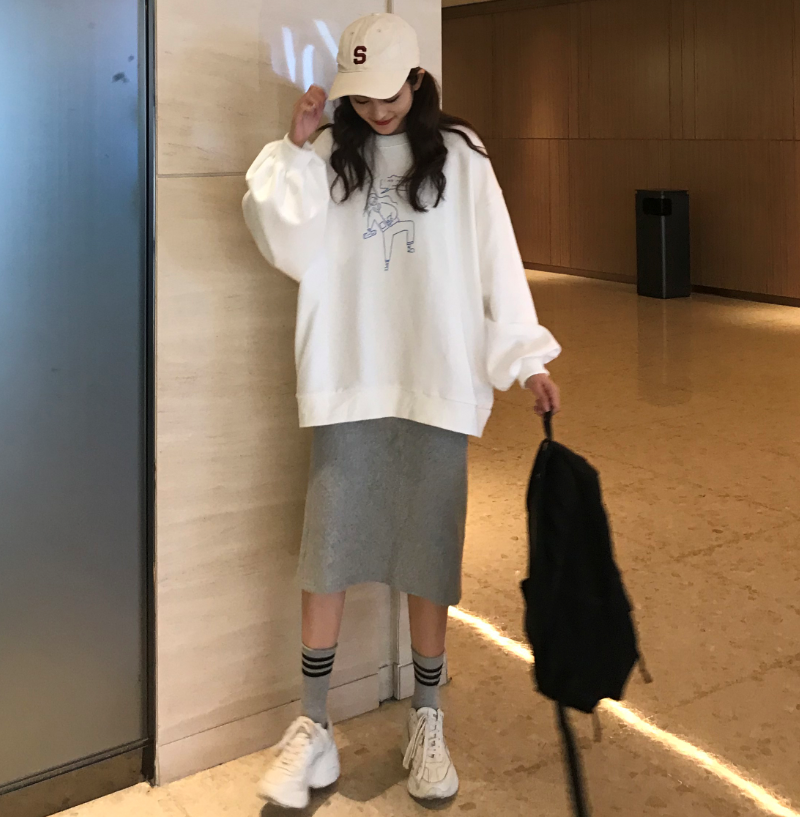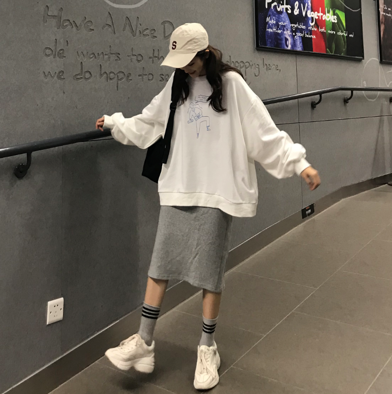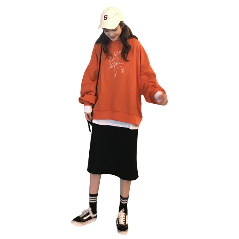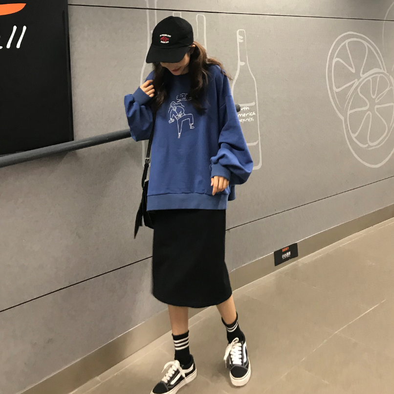 / 韓版時尚休閑套裝秋季卡通中長款衛衣外套+包臀裙半身裙兩件套女