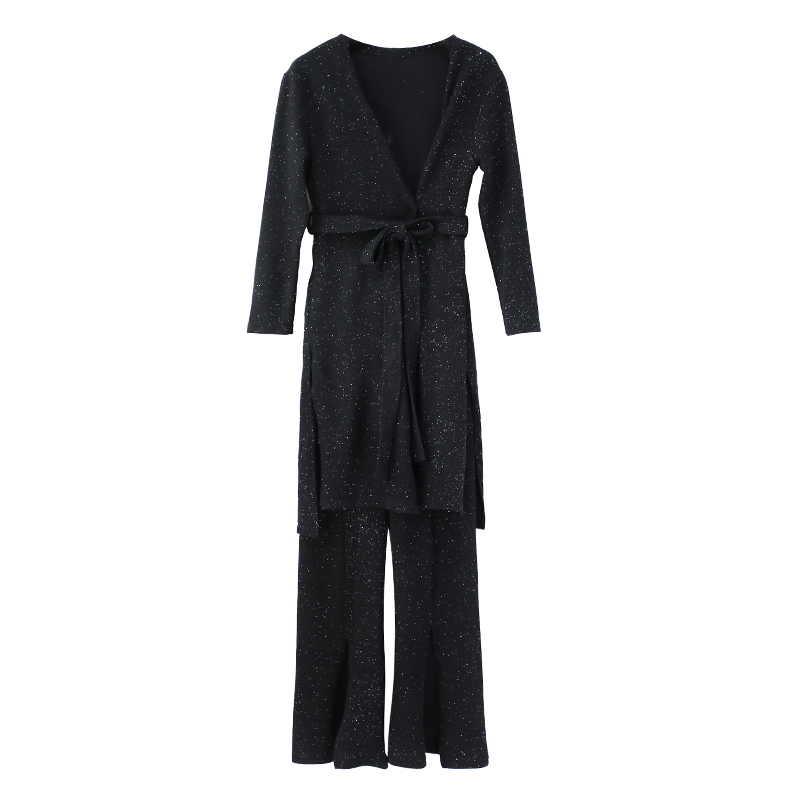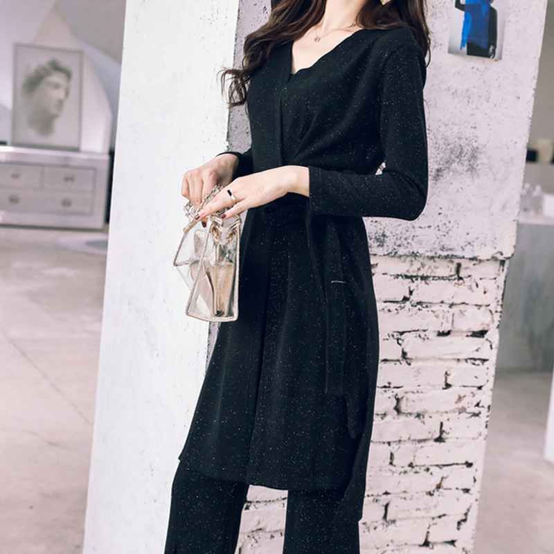 2018秋冬新款韓版長袖開衫休閑中長款收腰外套開叉長褲兩件套裝潮