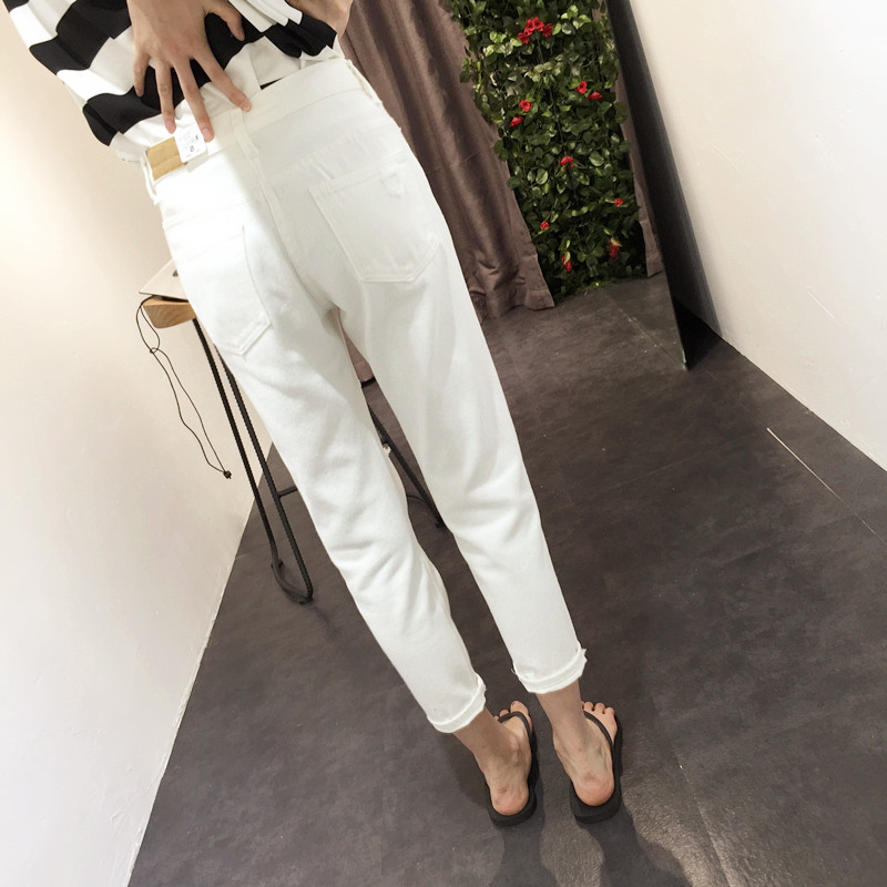 春季女裝韓版寬松流蘇破洞白色低腰牛仔褲女學生顯瘦小腳哈倫褲潮