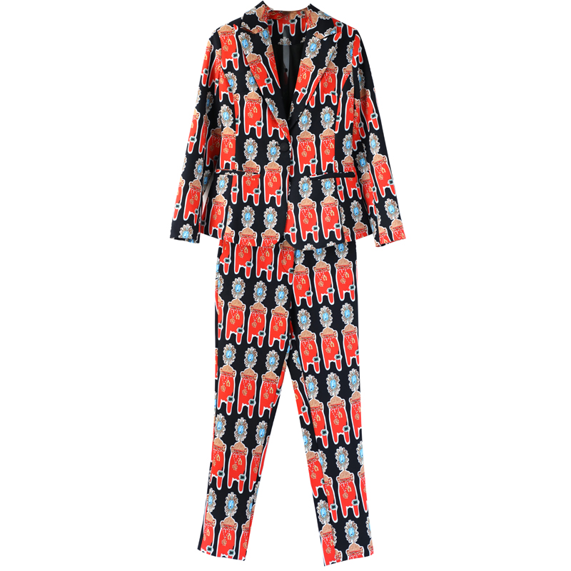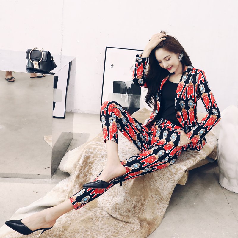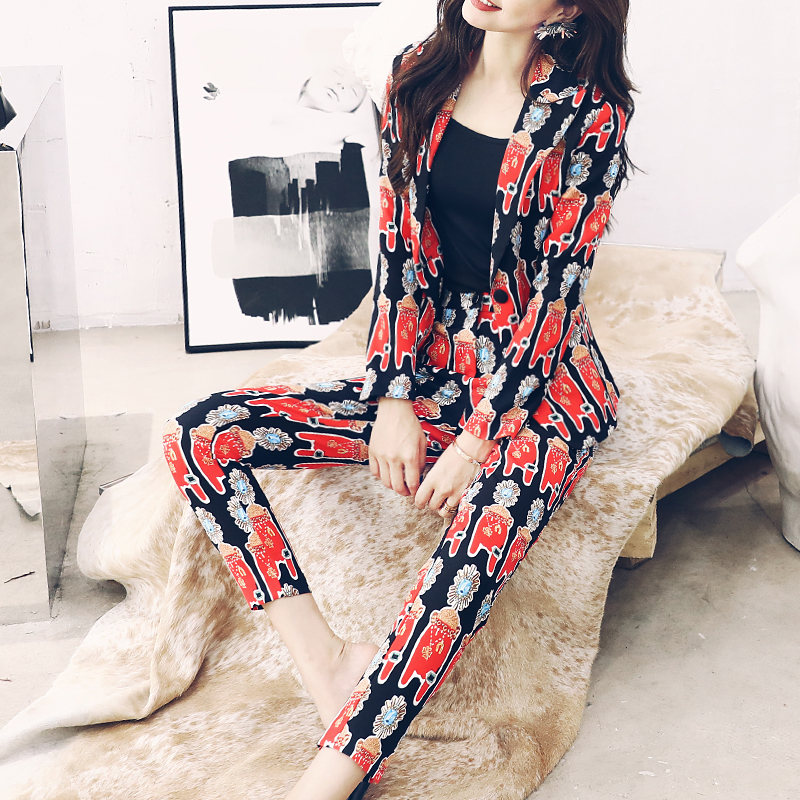 / 提花圖案歐貨時髦套裝女2018秋季新款俏皮港味休閑西裝小腳褲兩件