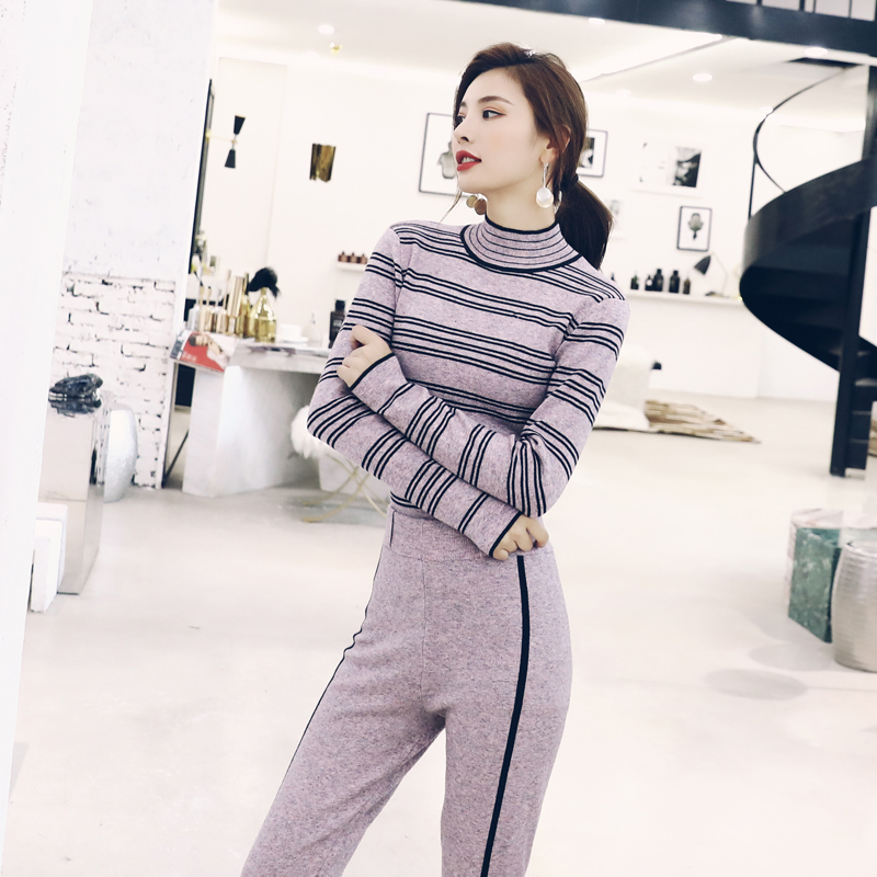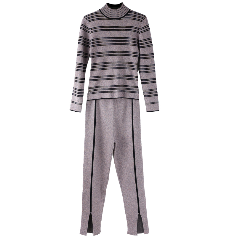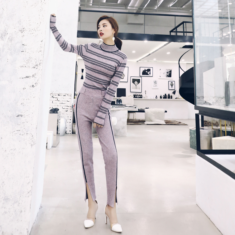 秋季女套裝2018新款時尚長袖chic針織上衣毛衣休閑開叉小腳褲兩件