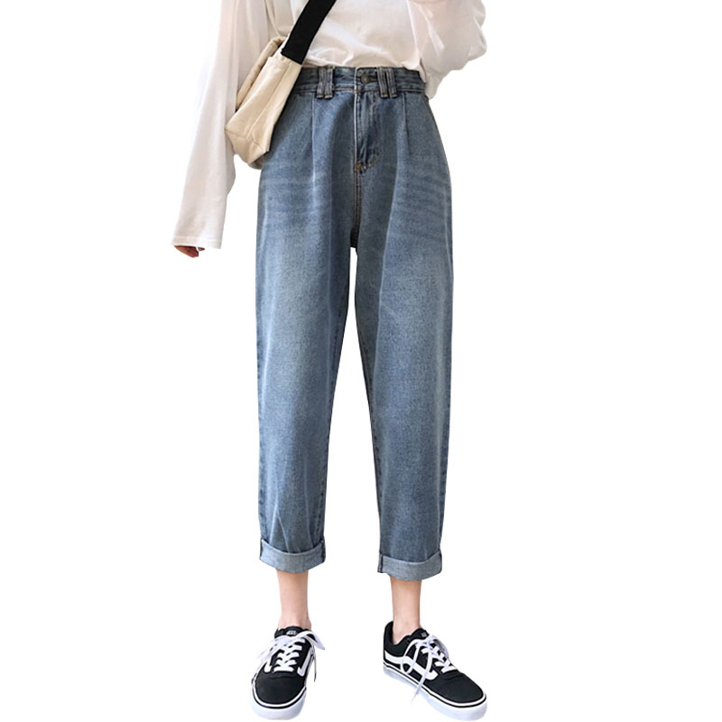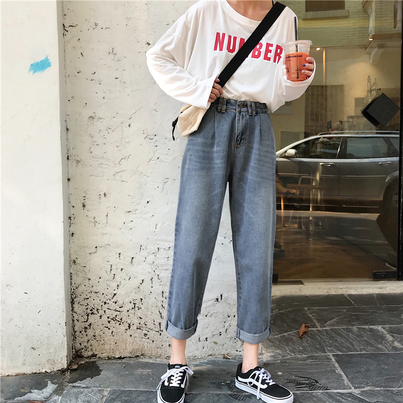 秋裝女裝韓版寬松復古水洗做舊牛仔褲高腰顯瘦闊腿褲直筒褲九分褲