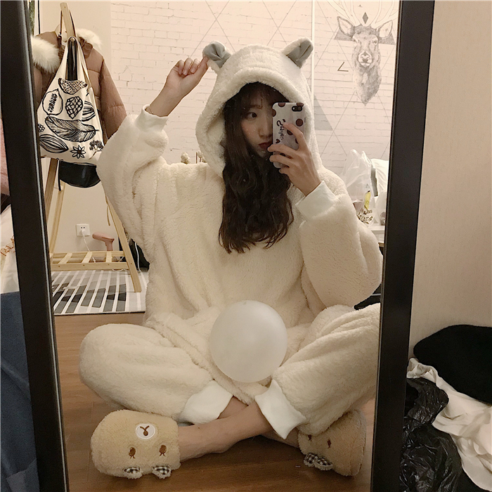 / 秋冬女裝韓版甜美可愛毛毛絨兔耳朵長袖睡衣睡褲兩件套家居服套裝