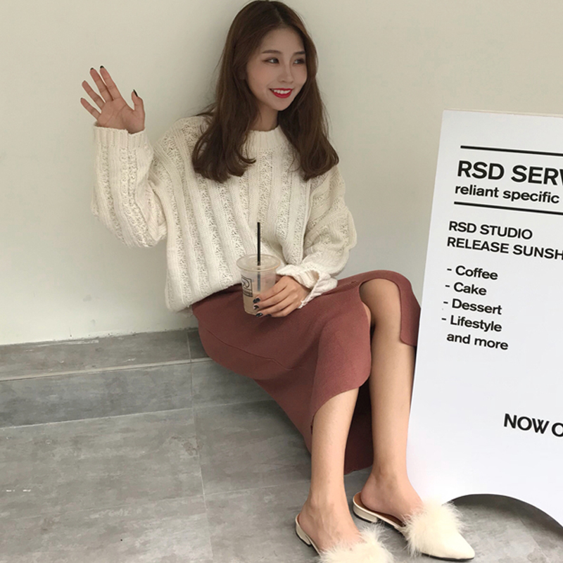 / 韓版時尚休閑套裝秋季女裝套頭毛衣針織衫+高腰開叉半身裙兩件套