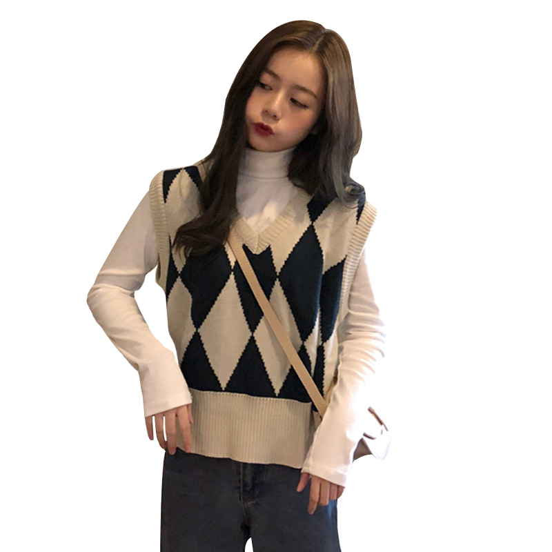 / 韓版時尚休閑套裝秋季女裝菱格V領針織馬甲+高領長袖打底衫兩件套