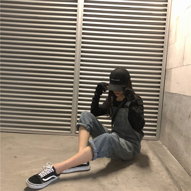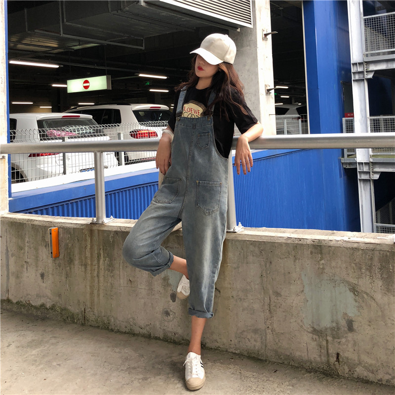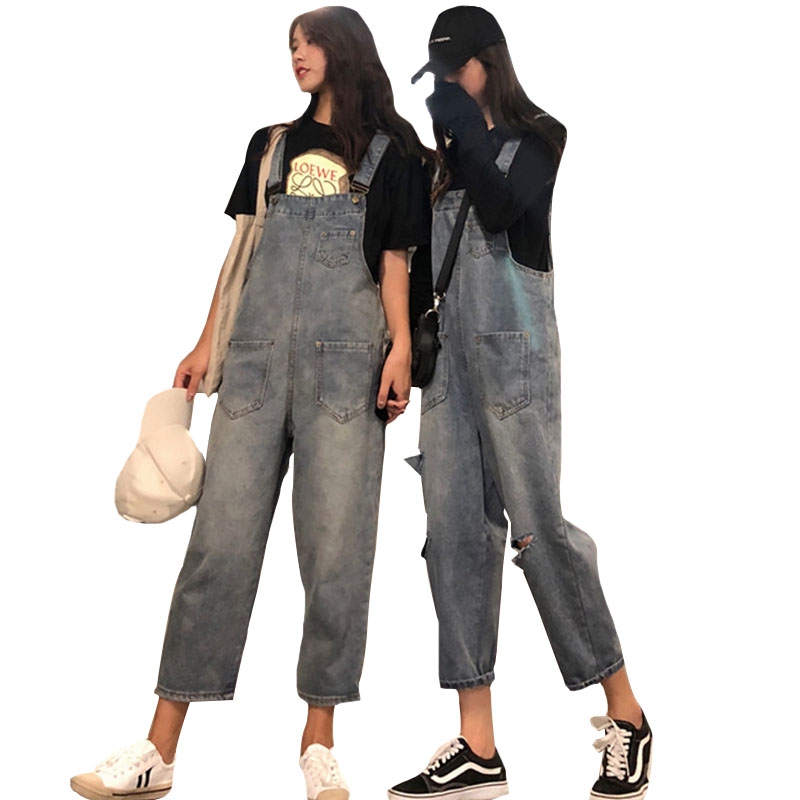 / 秋裝女裝韓版寬松復古做舊背帶連體褲牛仔褲高腰破洞闊腿褲九分褲