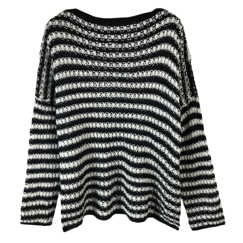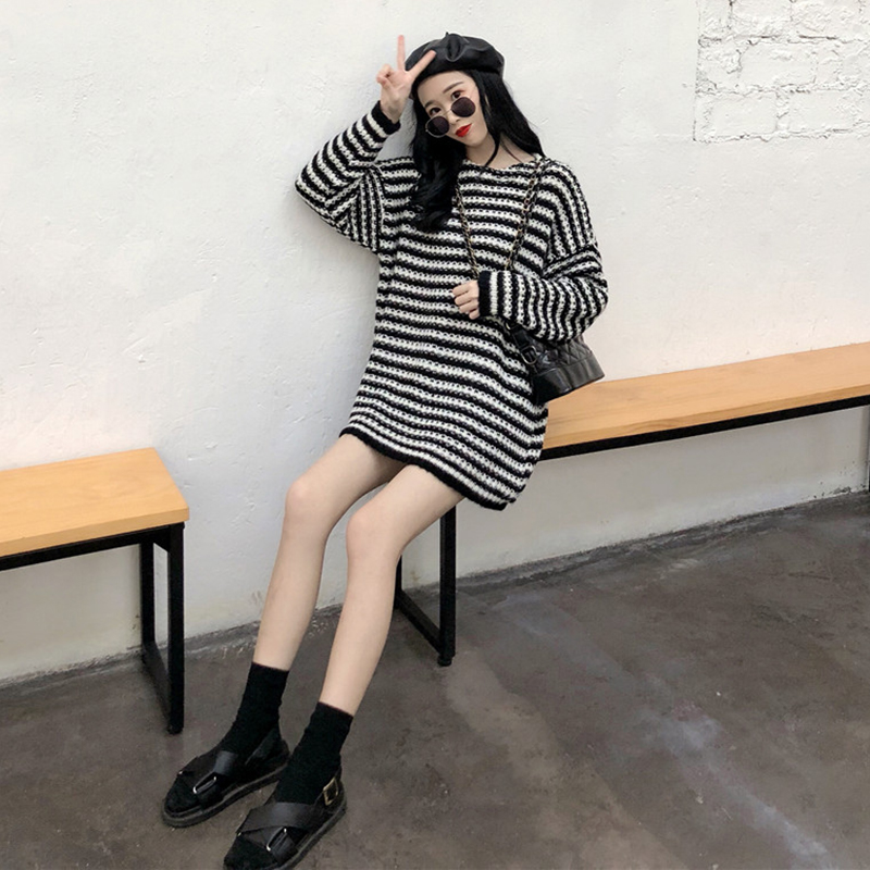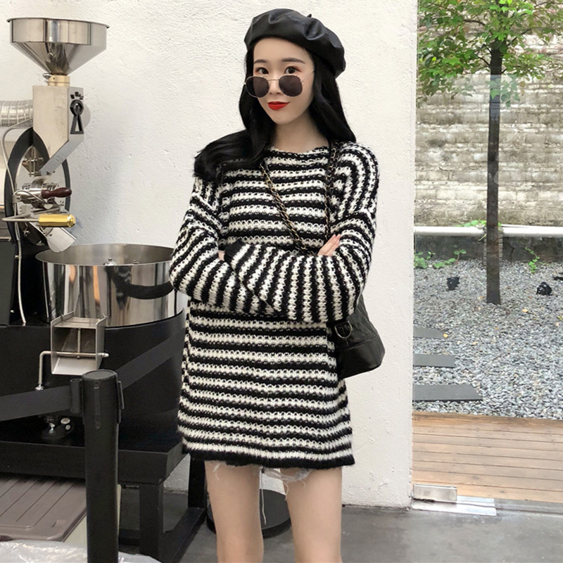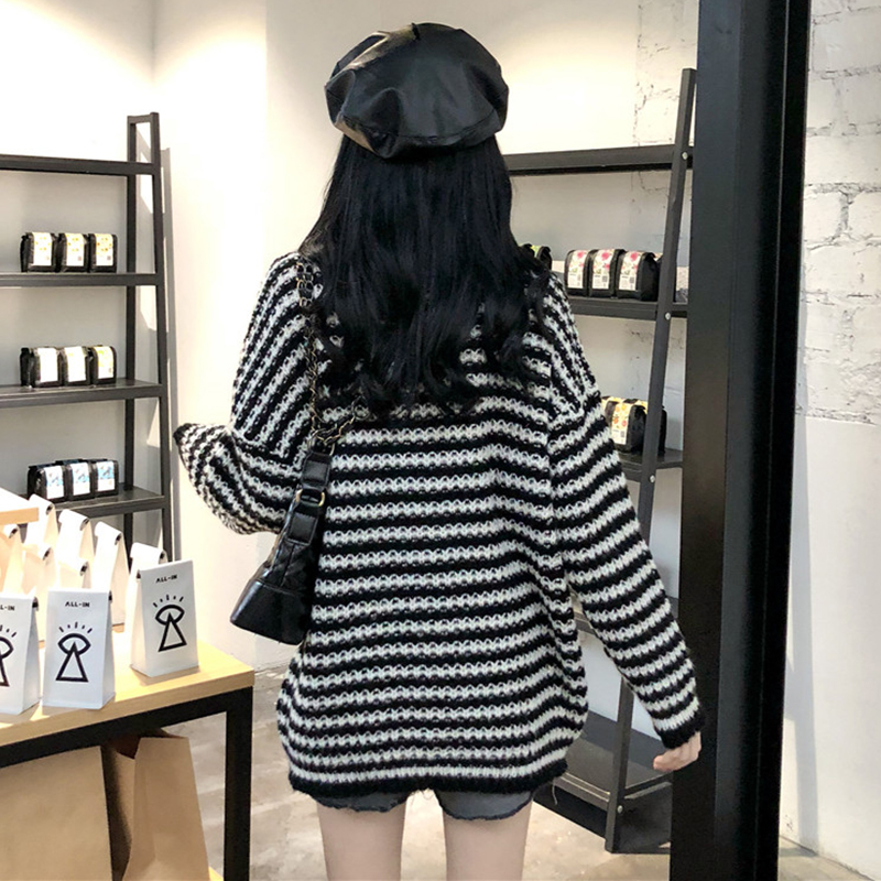 / 韓版慵懶風條紋長袖針織衫毛衣女2018新款寬松學生休閑中長款上衣