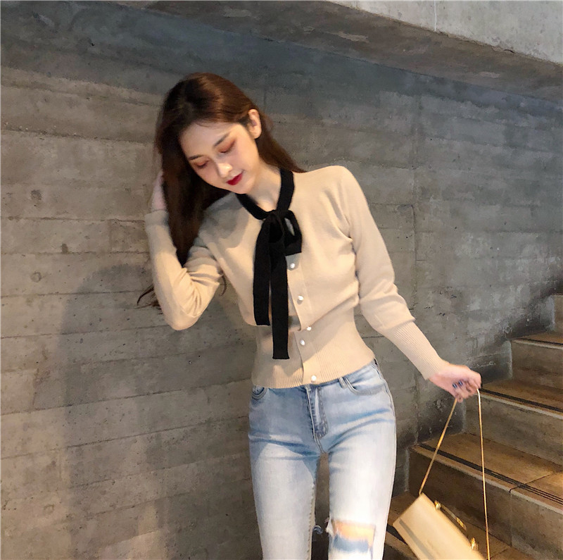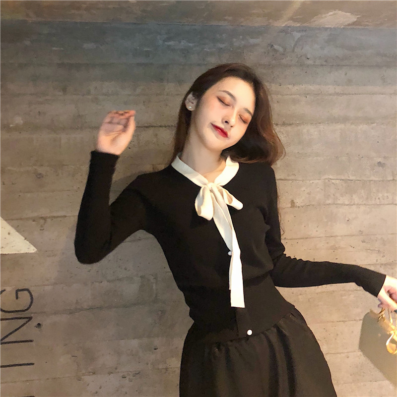 / 洋氣小衫時尚設計感上衣女秋季蝴蝶結開衫長袖短款外搭針織襯衫潮