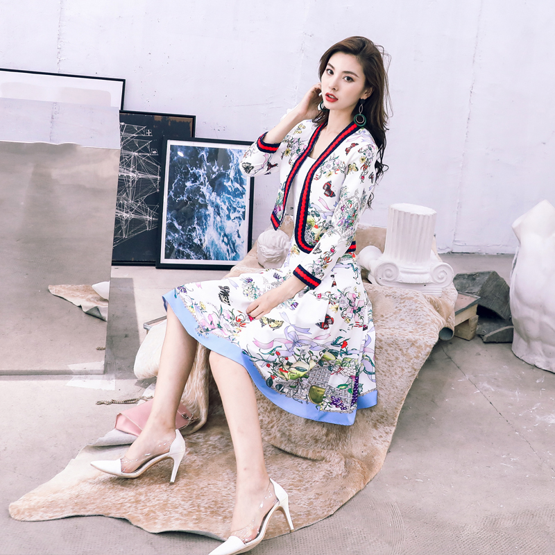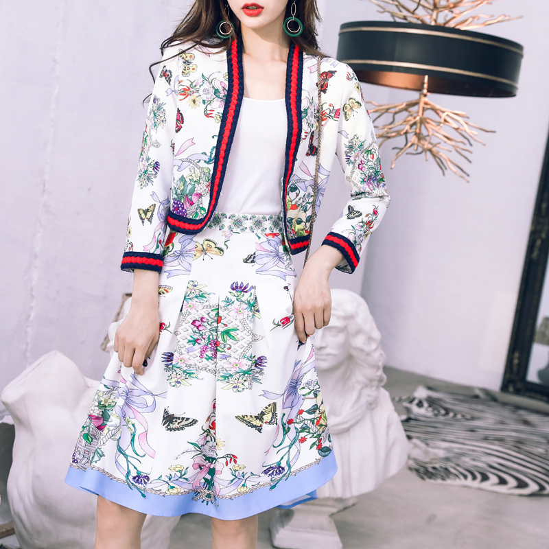 / 名媛氣質2018秋季新款復古女印花外套百褶半身傘裙小個子兩件套裝