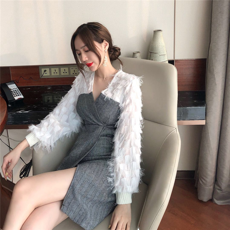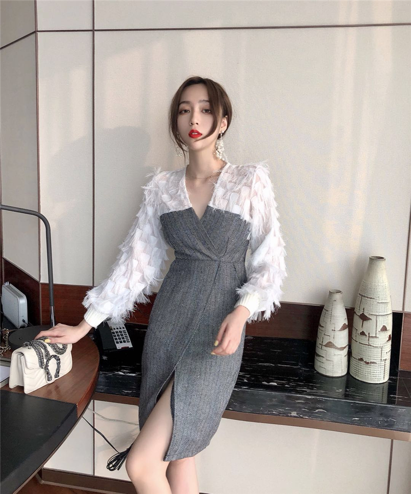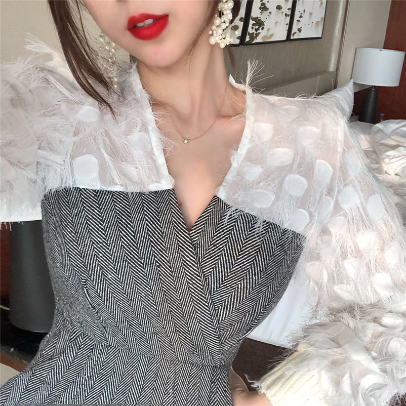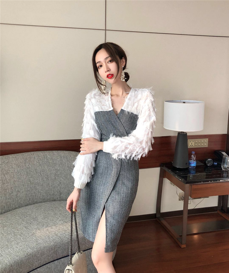 雪紡流蘇長袖衫拼接人字紋連衣裙假兩件,