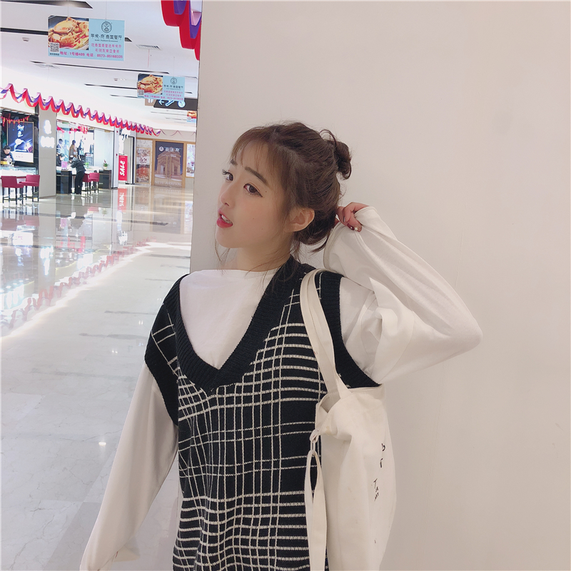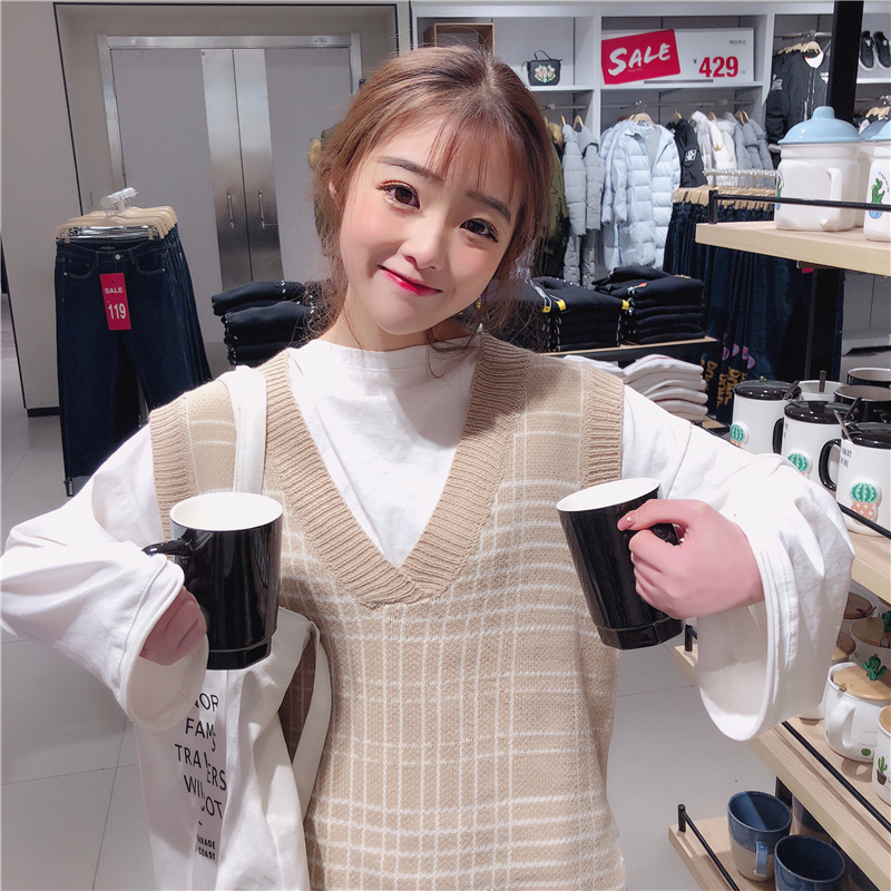 / 秋季女裝韓版寬松格子馬夾背心復古休閑無袖毛衣針織衫馬甲外套潮