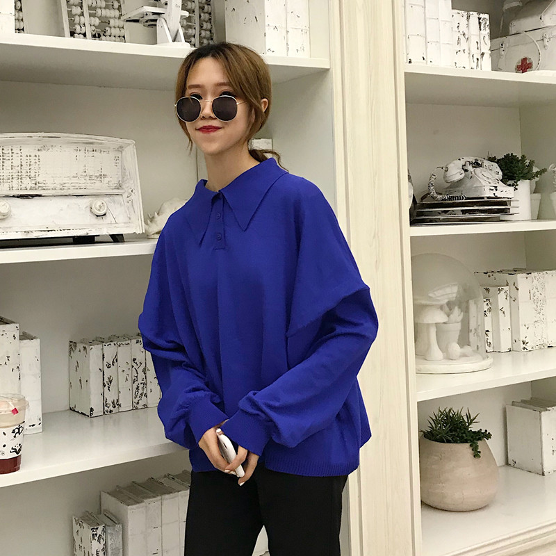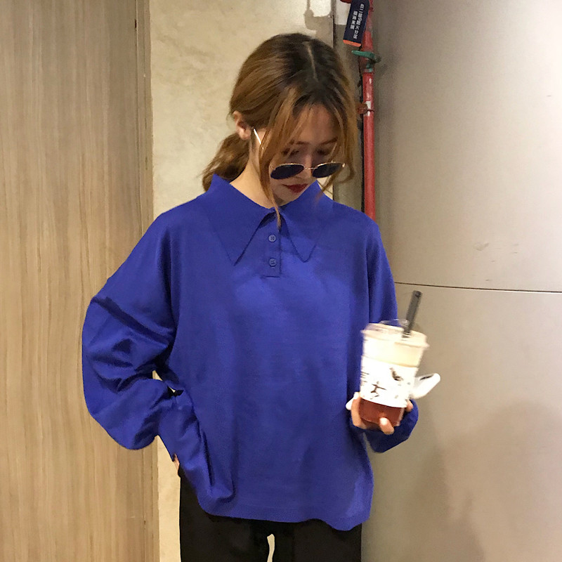 / 秋季女裝韓版chic寬松慵懶風純色polo領套頭燈籠袖毛衣針織衫上衣