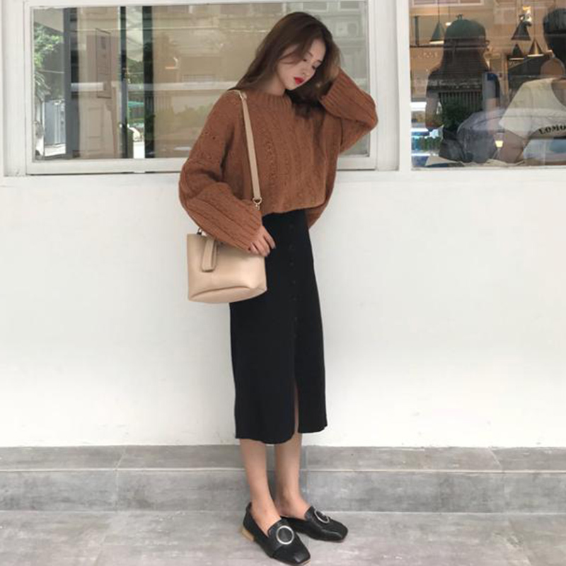 / 秋季韓版套裝女裝休閑套頭毛衣針織衫+高腰開叉半身裙學生兩件套