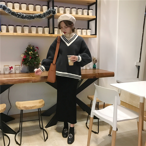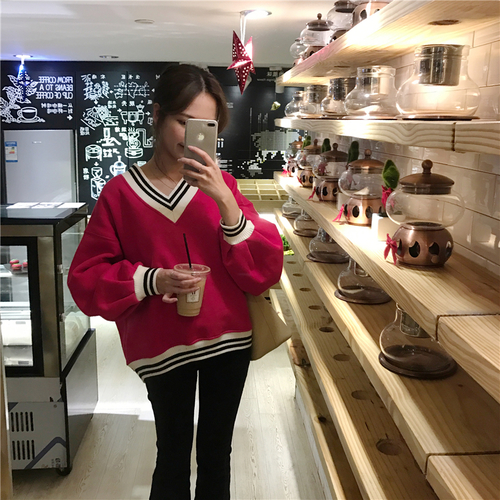 2018新款秋冬韓版學院風V領寬松加絨加厚套頭超火衛衣上衣外套女