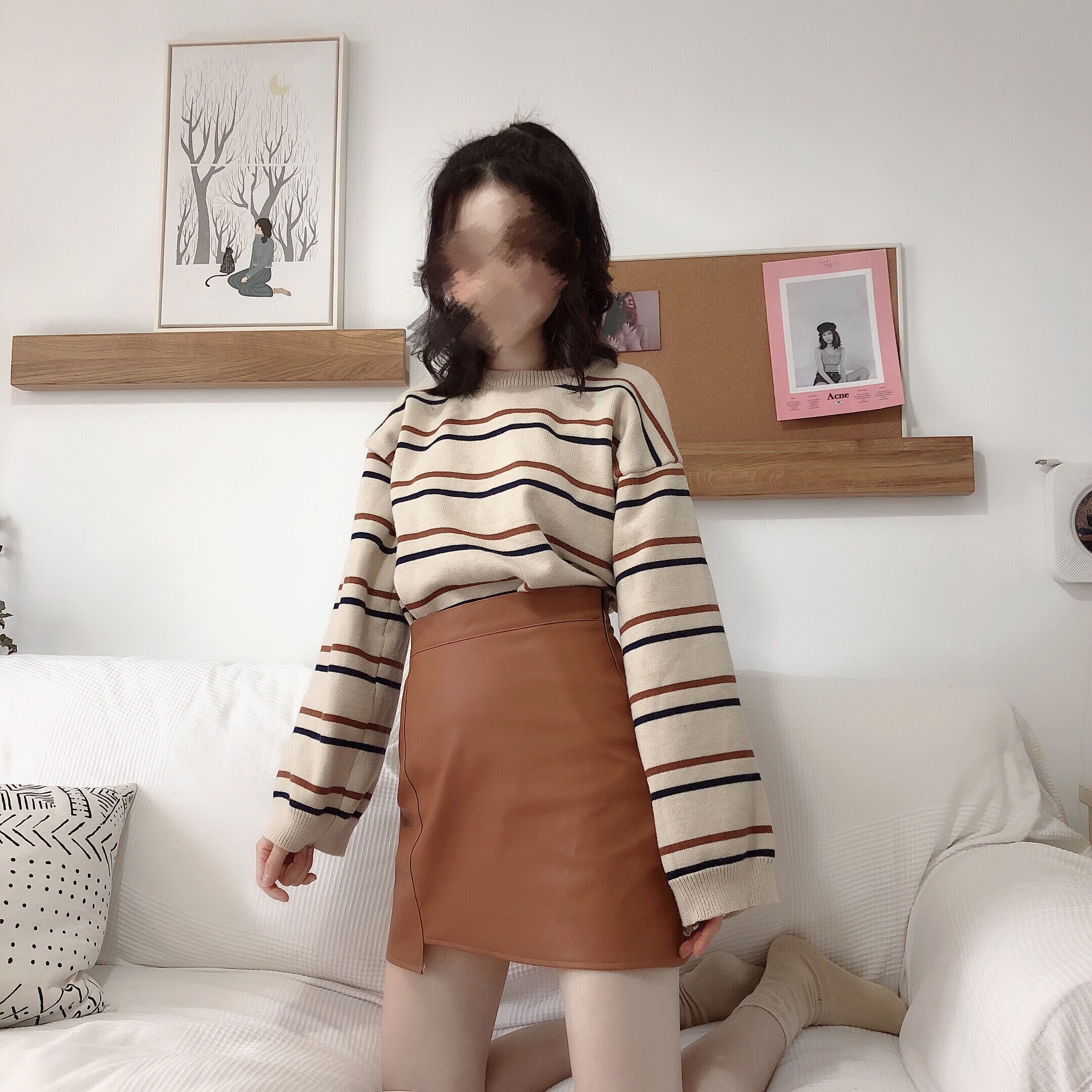 條紋毛衣單件|皮短裙單件