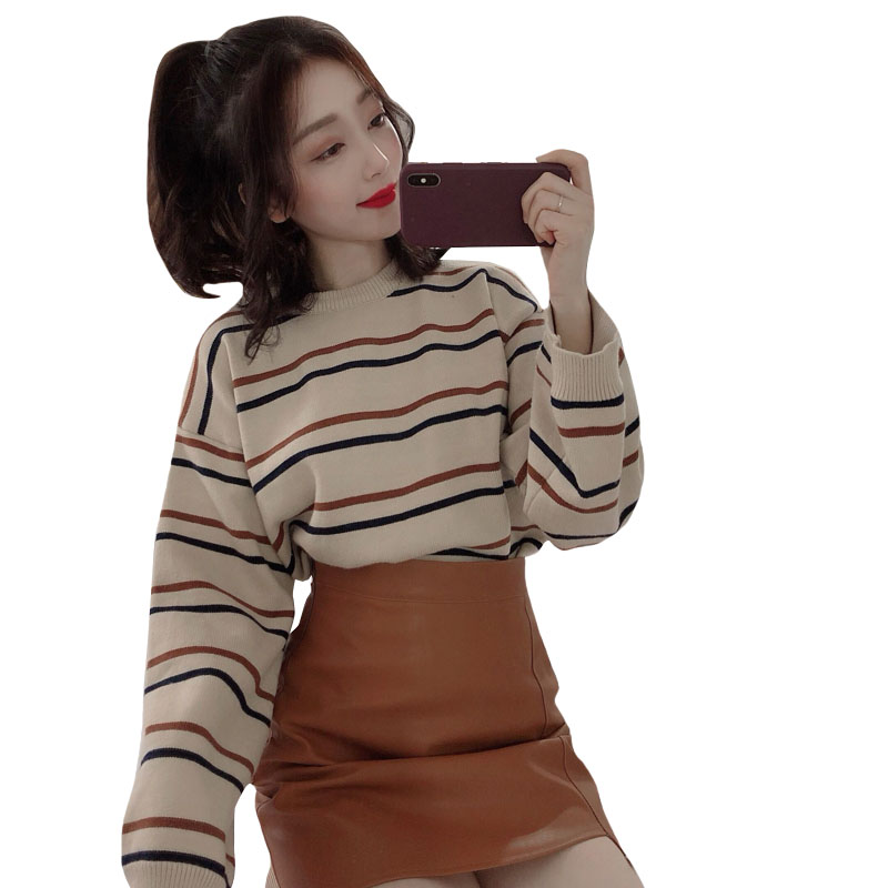 / 韓版時尚休閑套裝秋季條紋加厚針織毛衣+A字半身裙皮短裙兩件套女