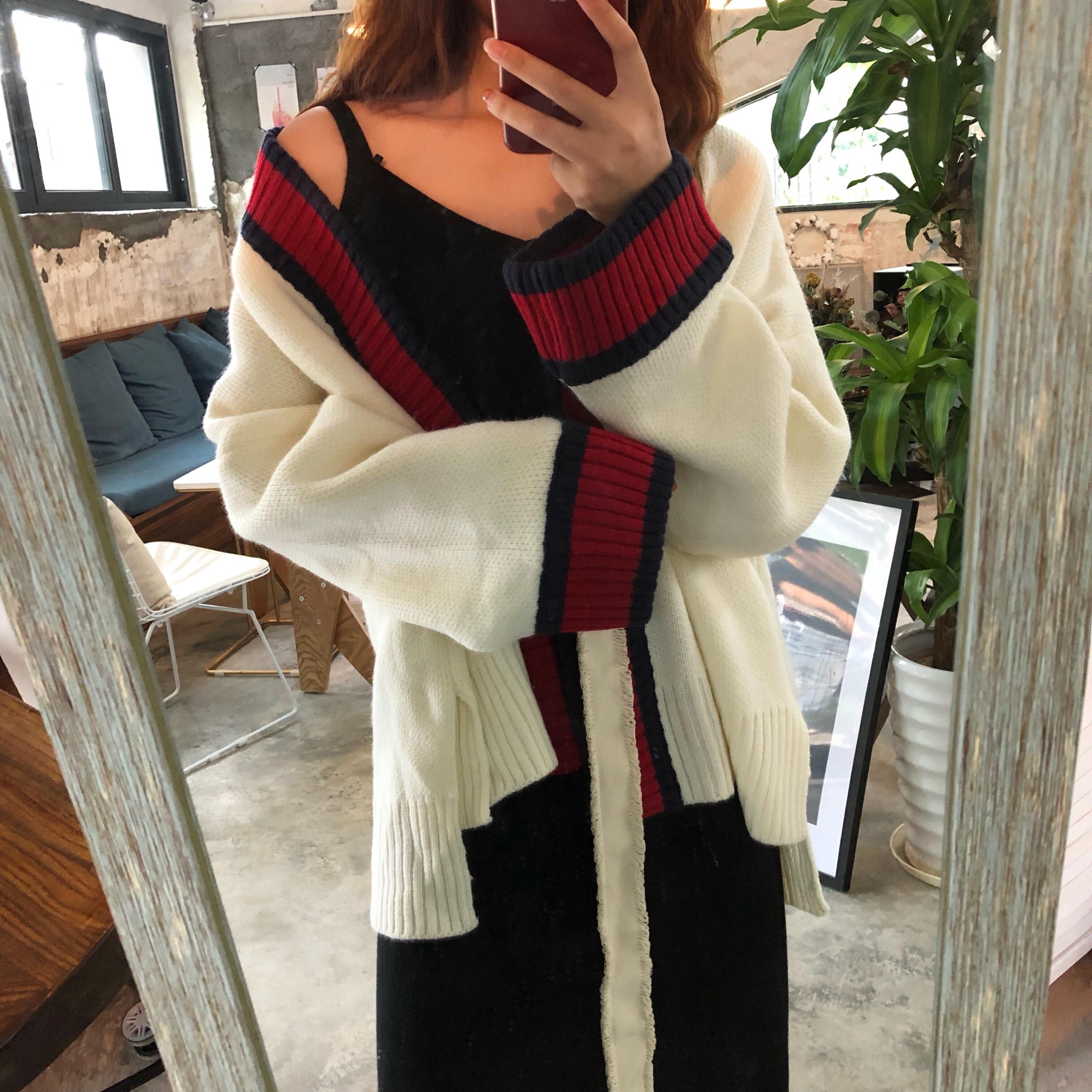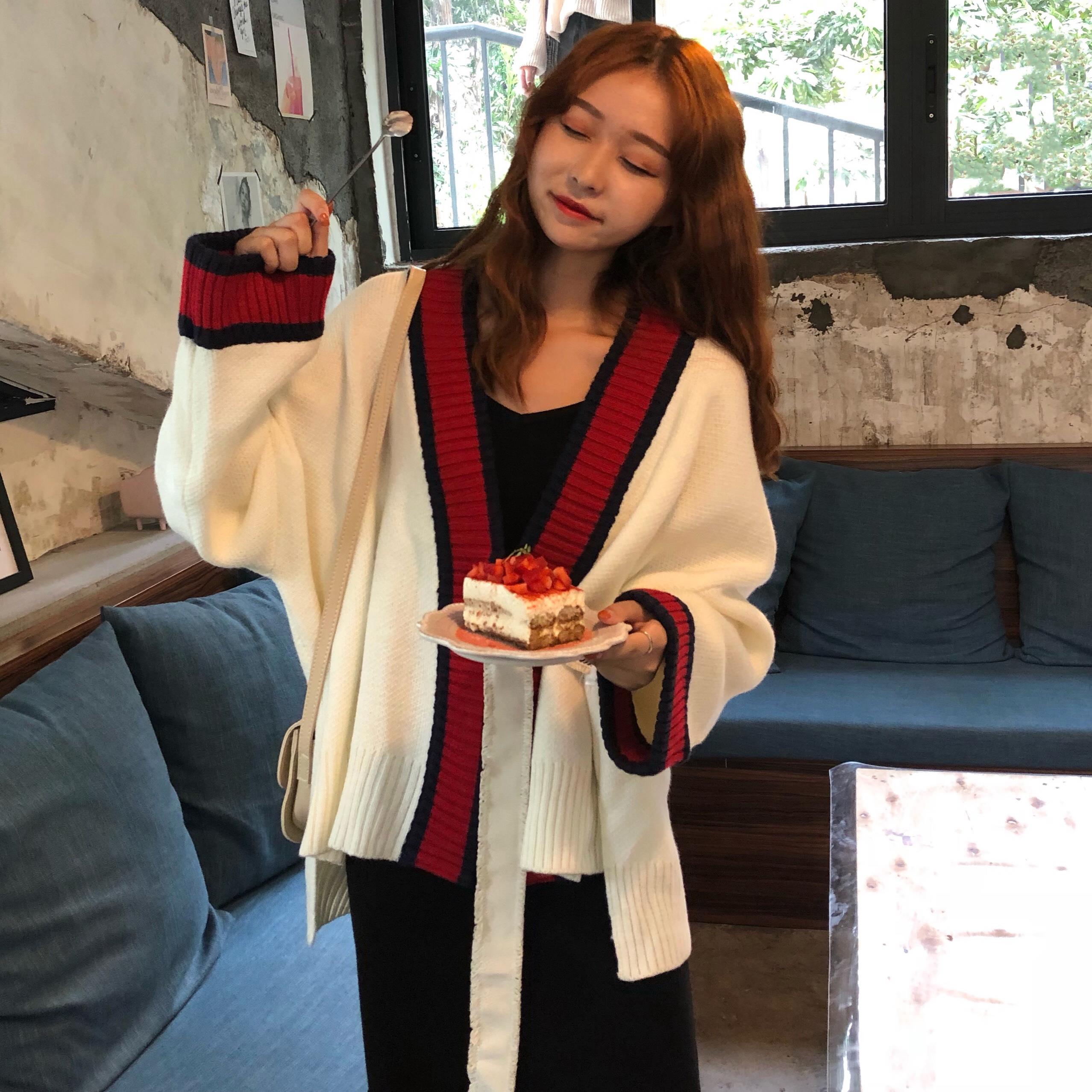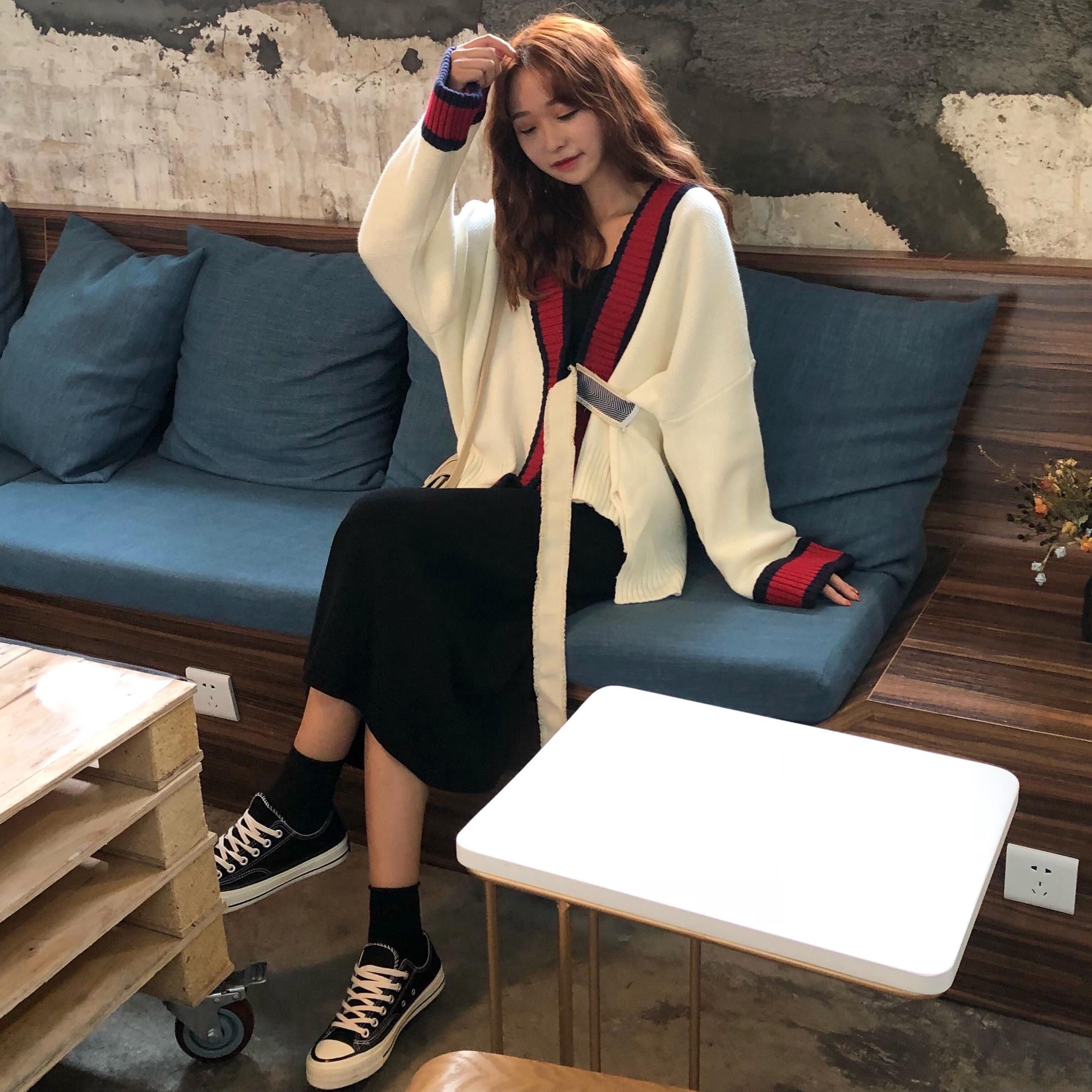 / 韓版時尚休閑套裝秋季女裝慵懶風針織毛衣外套+吊帶連衣裙兩件套