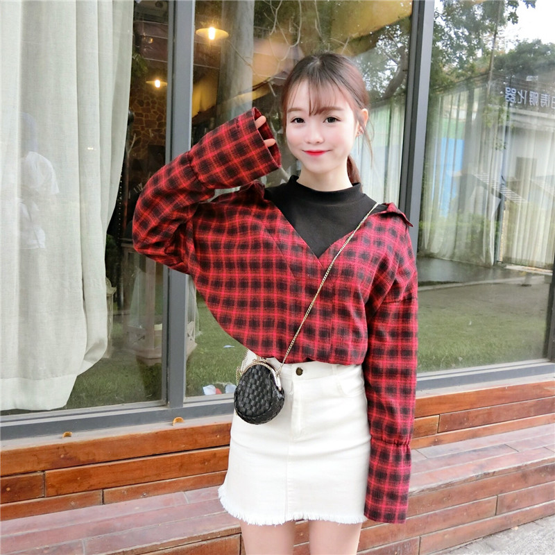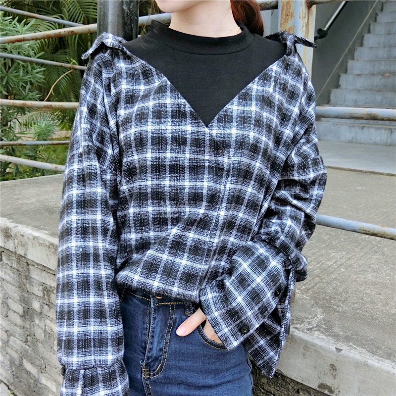 2018新款秋季女裝韓版拼接假兩件襯衣寬松條紋格子長袖襯衫上衣潮