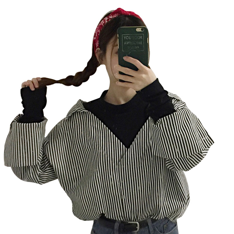 / 2018新款秋季女裝韓版拼接假兩件襯衣寬松條紋格子長袖襯衫上衣潮