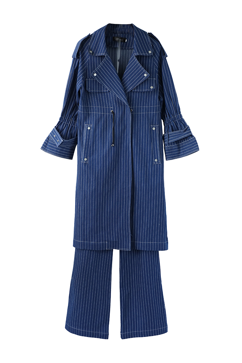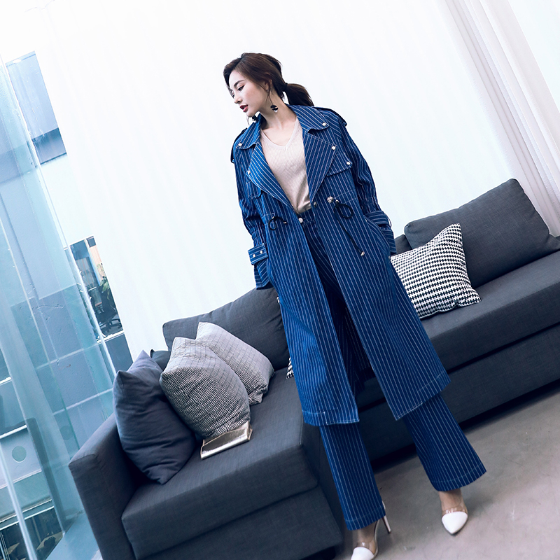 / 2018時尚秋韓版條紋中長款帥氣風衣外套時髦兩件套長闊腿褲套裝女