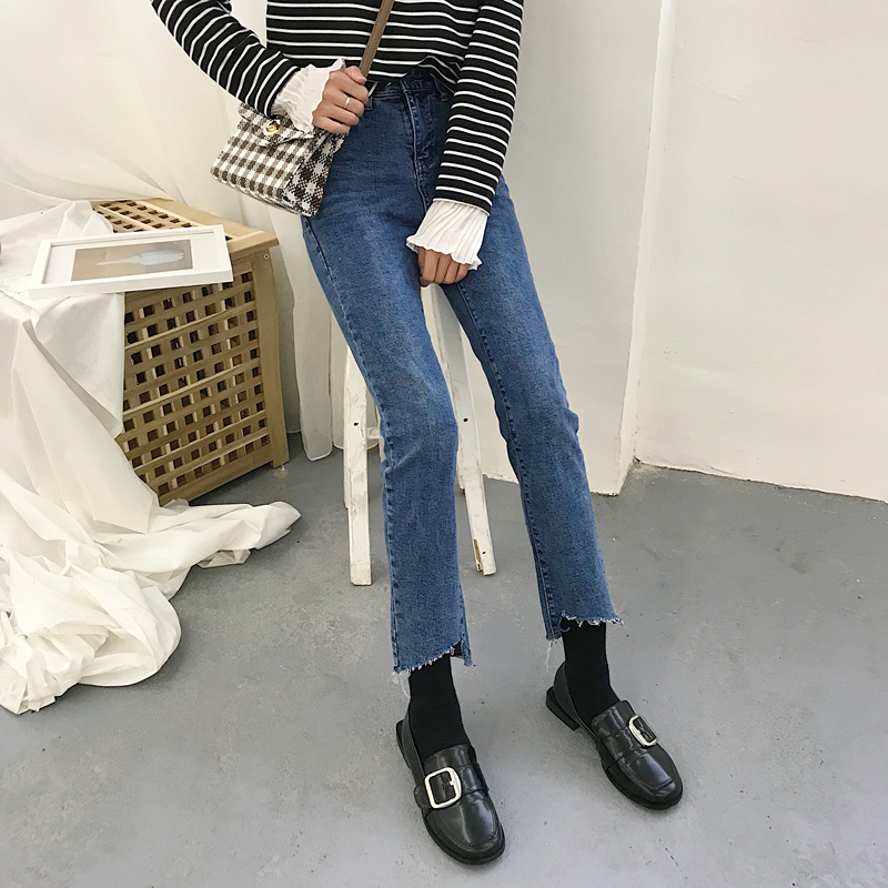 秋裝女裝韓版寬松彈力高腰顯瘦不規則褲腳直筒褲九分褲牛仔褲長褲