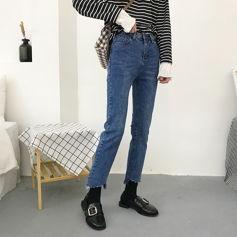 / 秋裝女裝韓版寬松彈力高腰顯瘦不規則褲腳直筒褲九分褲牛仔褲長褲