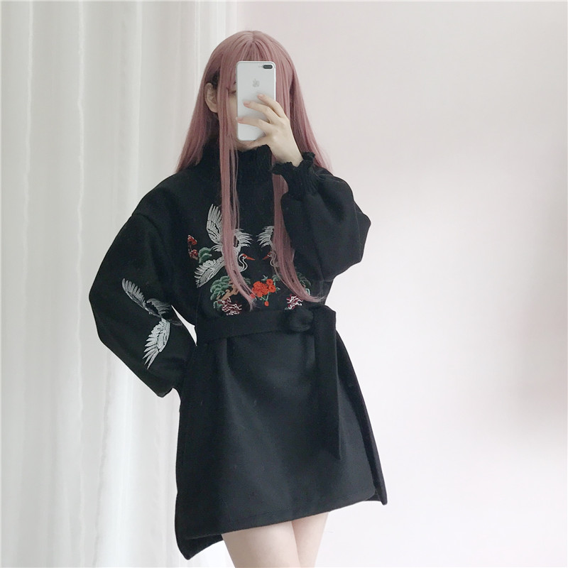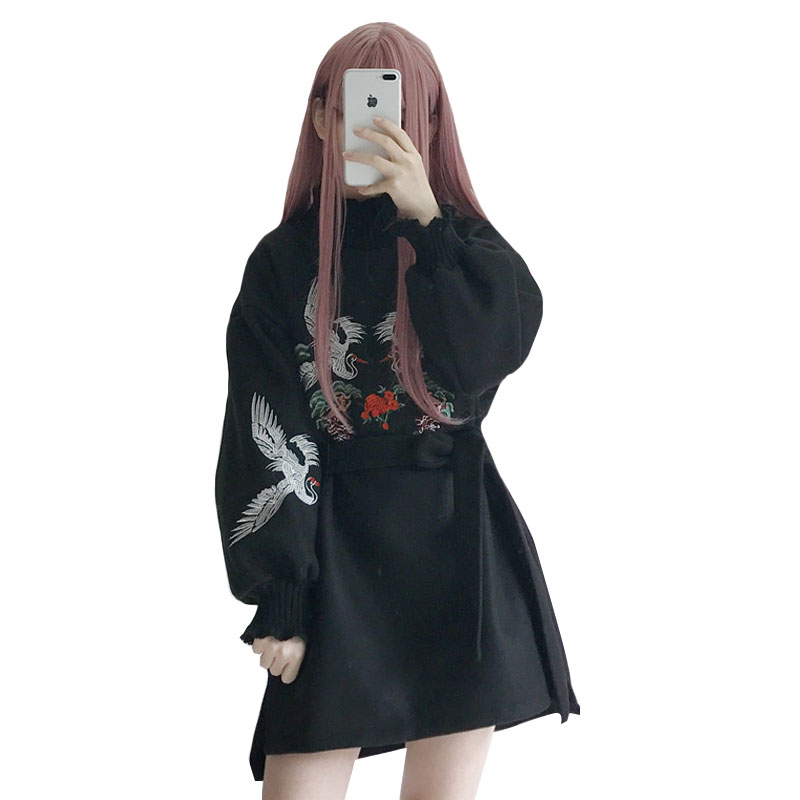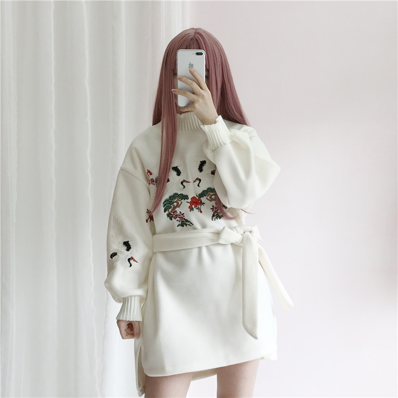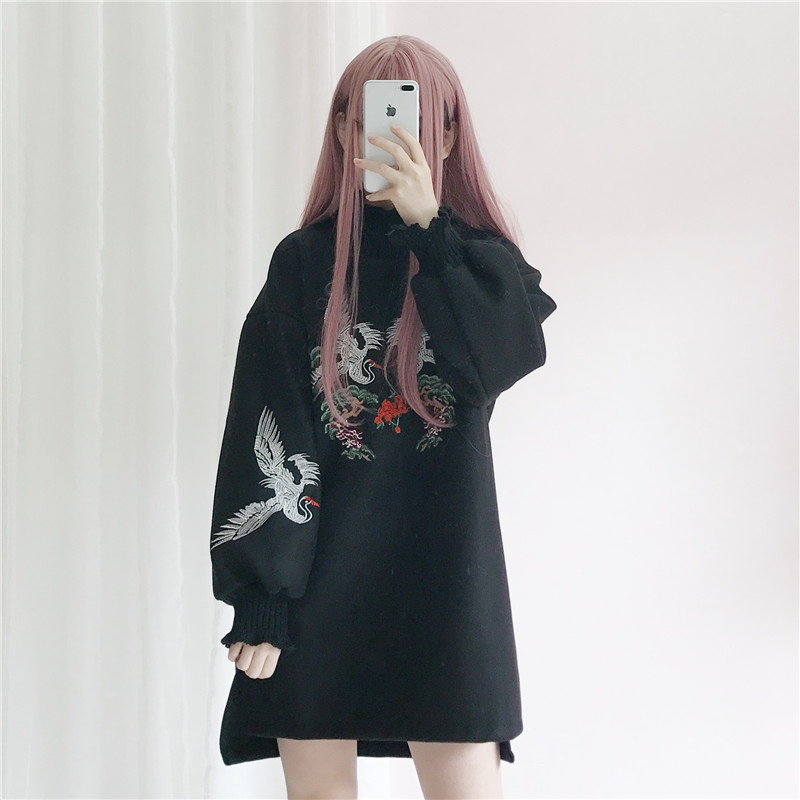 / 秋冬女裝韓版加絨加厚甜美仙鶴寬松收腰中長款長袖連衣裙學生裙子