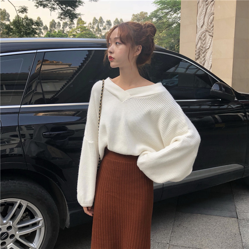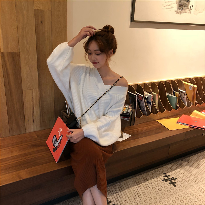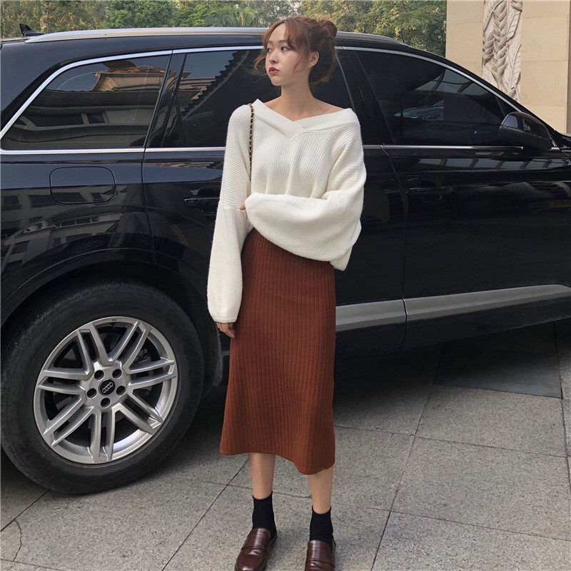 / 韓版時尚休閑套裝秋季女裝寬松v領針織毛衣+開叉包臀半身裙兩件套