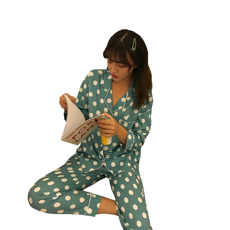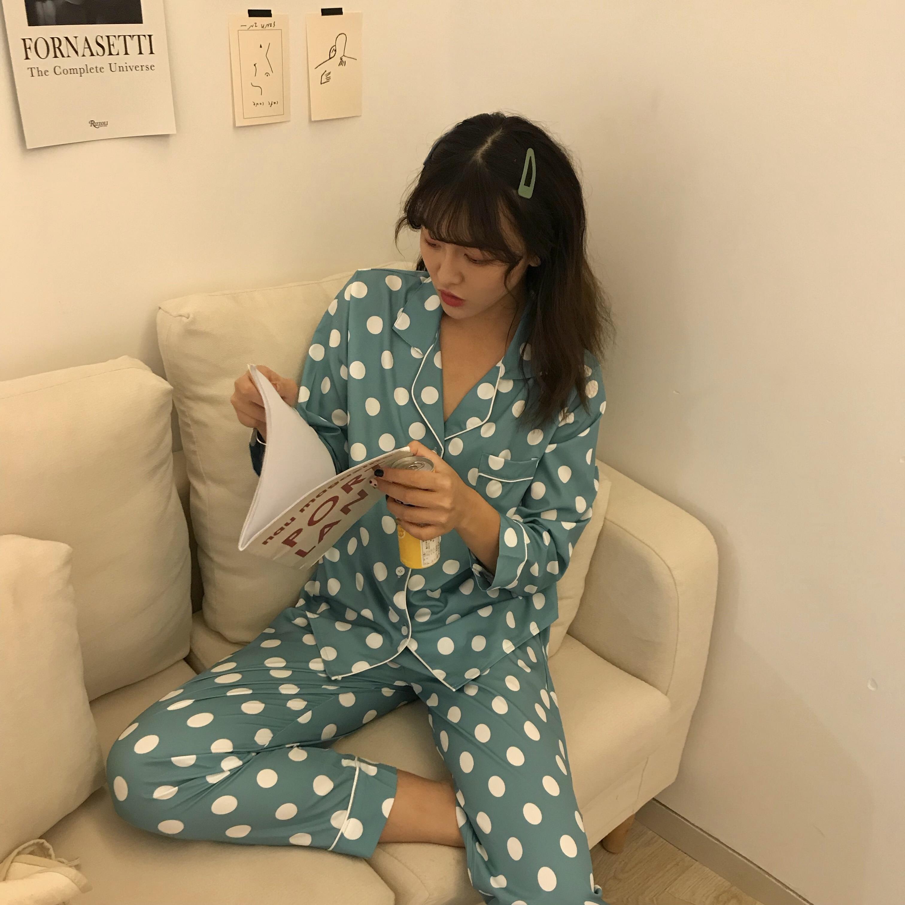 / 秋季女裝韓版甜美可愛波點長袖睡衣上衣長褲兩件套學生家居服套裝