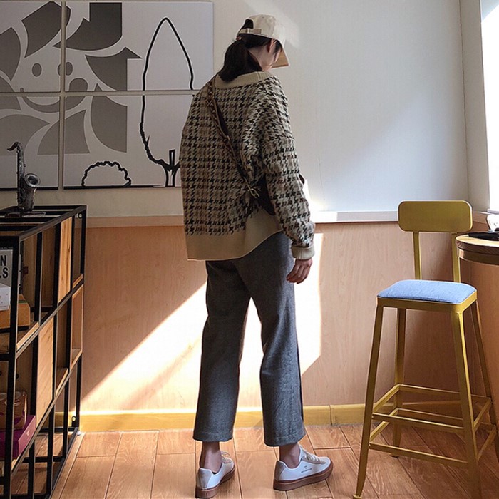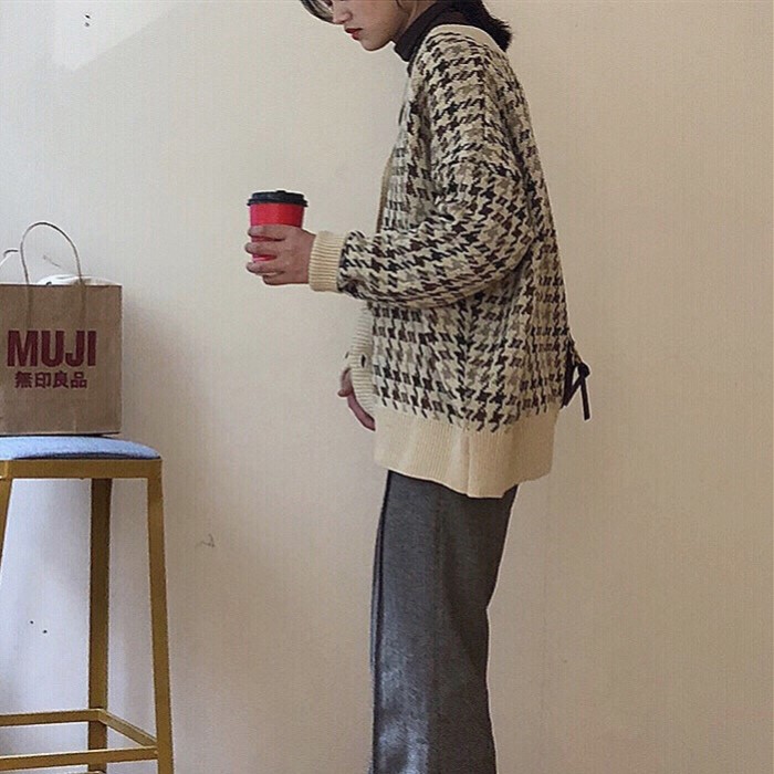 / 秋季女裝韓版BF風寬松百搭格子針織衫上衣學生長袖毛衣開衫外套潮