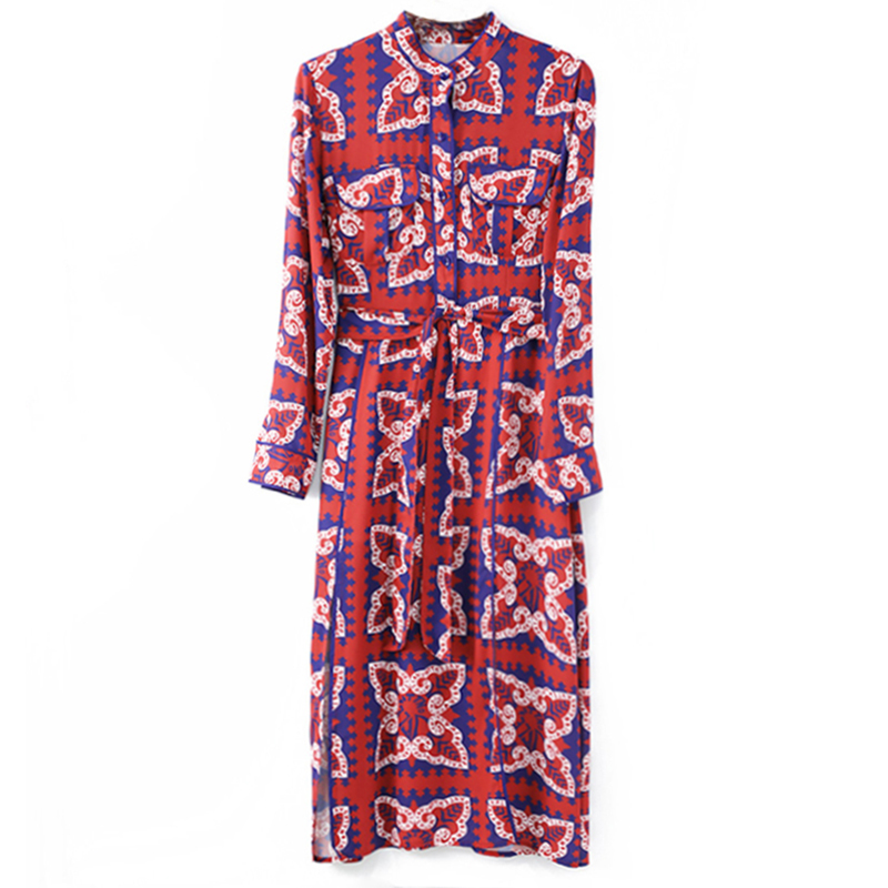 印花連衣裙長裙秋裝名媛氣質2018新款女裝復古收腰中長款襯衫裙子