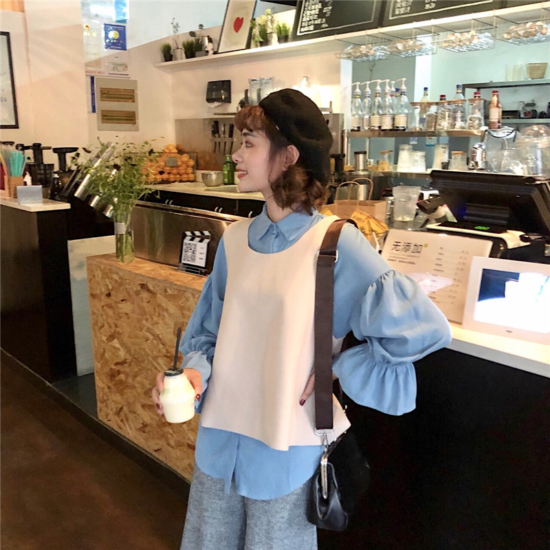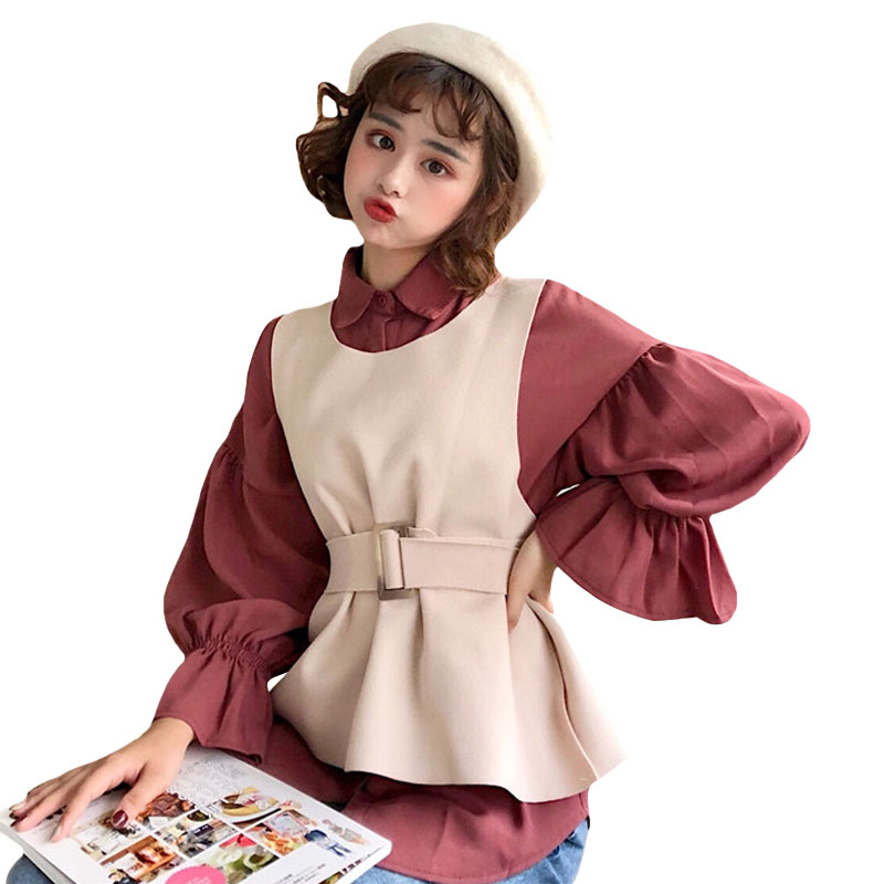 / 韓版時尚休閑套裝秋季寬松燈籠袖襯衫+呢料收腰馬甲背心兩件套女