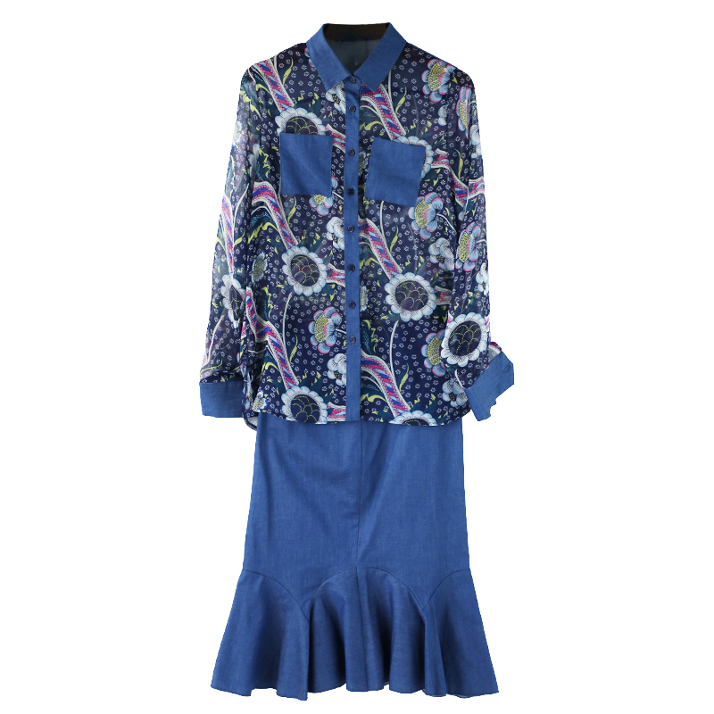 歐洲站秋裝俏皮減齡小心機復古拼接襯衫上衣牛仔短裙兩件套裝女潮
