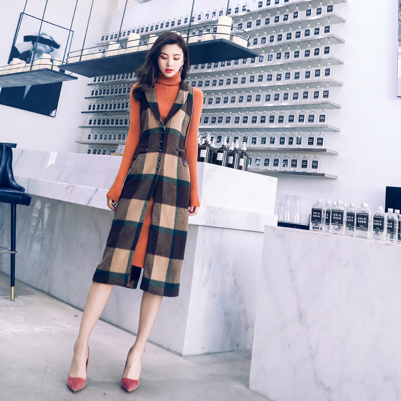名媛氣質馬甲套裝女2018秋新款中長款無袖毛呢馬甲高領針織連衣裙