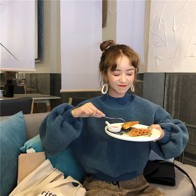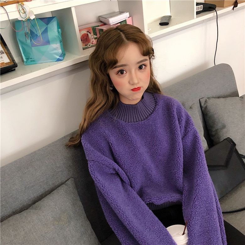 秋冬韓版復古慵懶風寬松仿羊羔毛加厚短款超火套頭衛衣上衣外套女