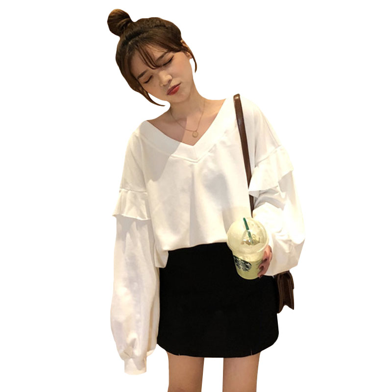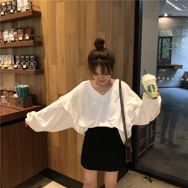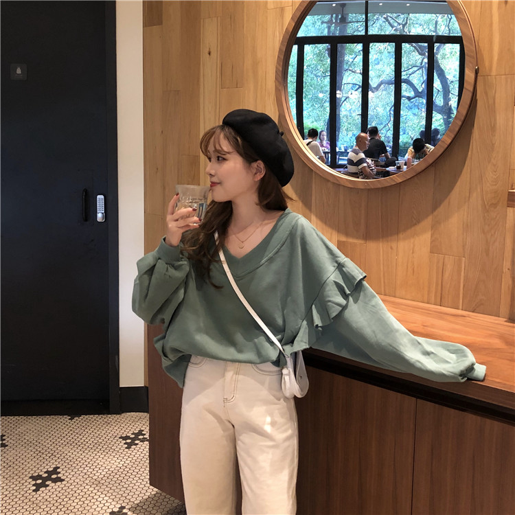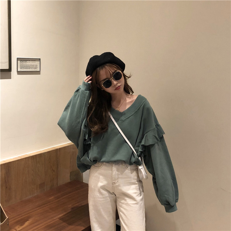 秋季韓版chic復古純色V領BF風寬松荷葉邊套頭超火衛衣上衣外套女
