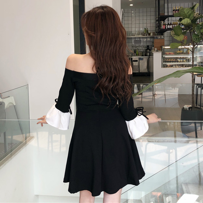 春季新款女裝韓版一字領露肩氣質黑白拼接喇叭袖學生A字連衣裙女
